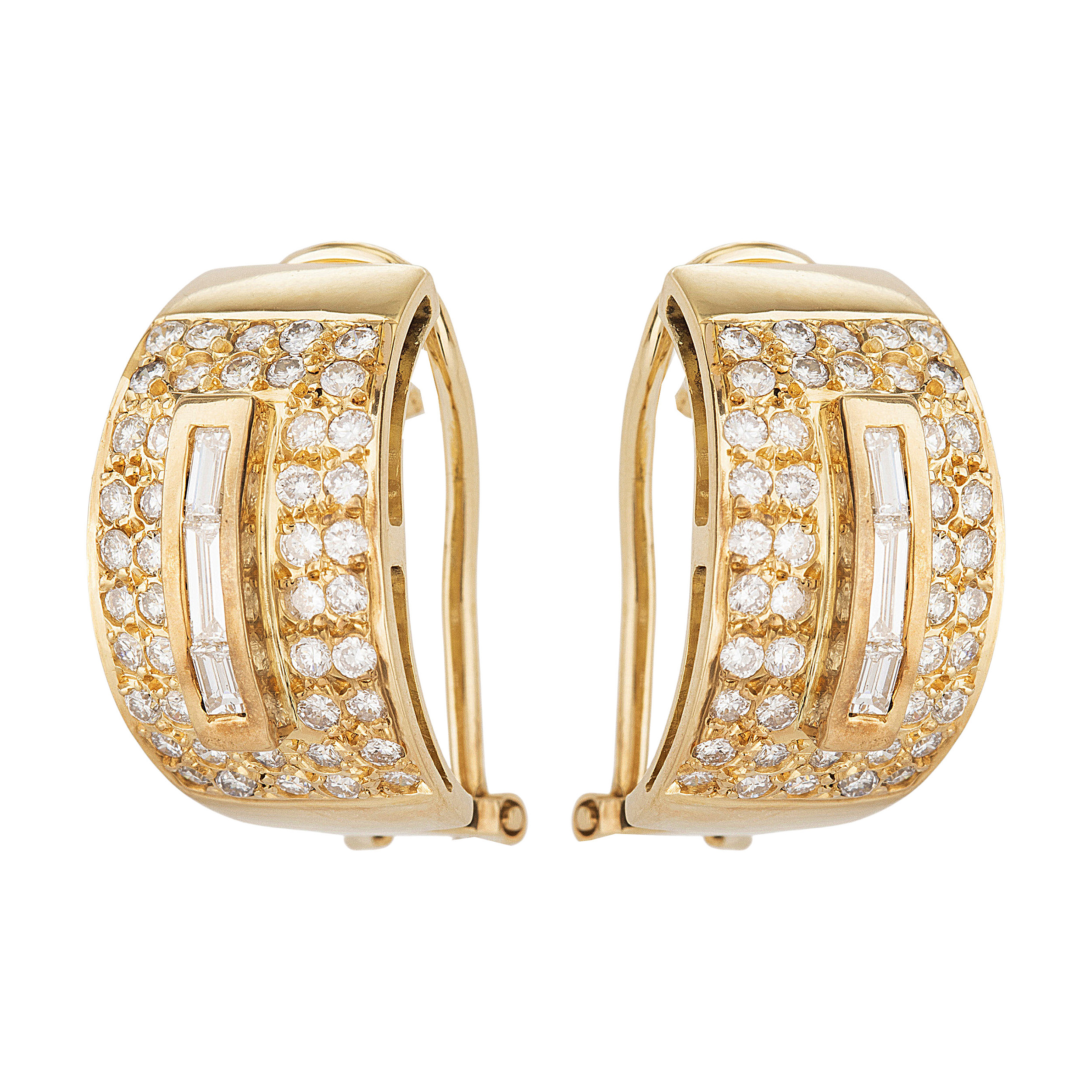Brinco de ouro amarelo com 2,32ct de diamantes (sendo 0,56ct de lapidação baguete/1,76ct de lapidação brilhante) e 10,5g. Medida 2,2cm.