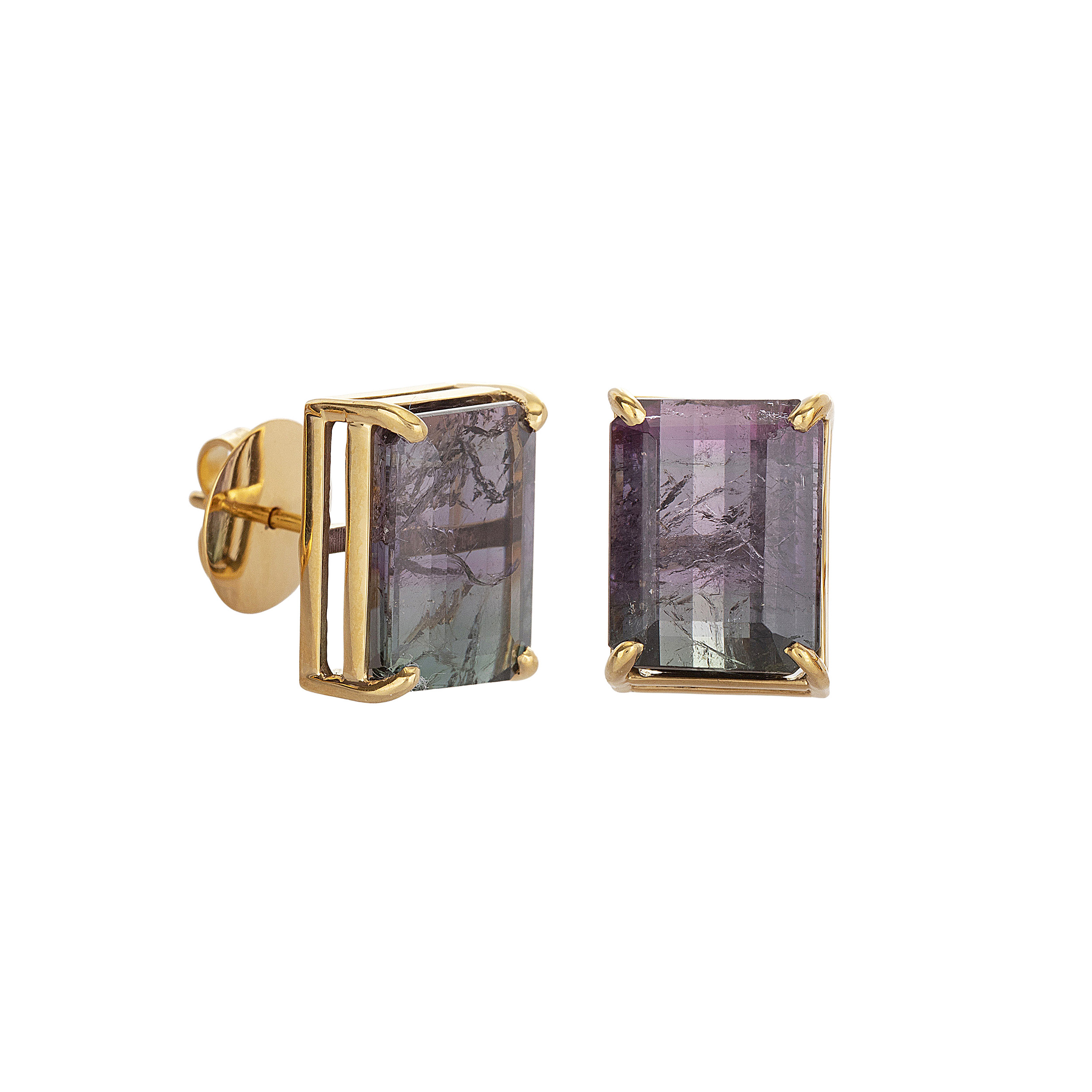 Brinco de ouro amarelo com turmalinas bicolores e 7,7g. Medida 1,4cm.