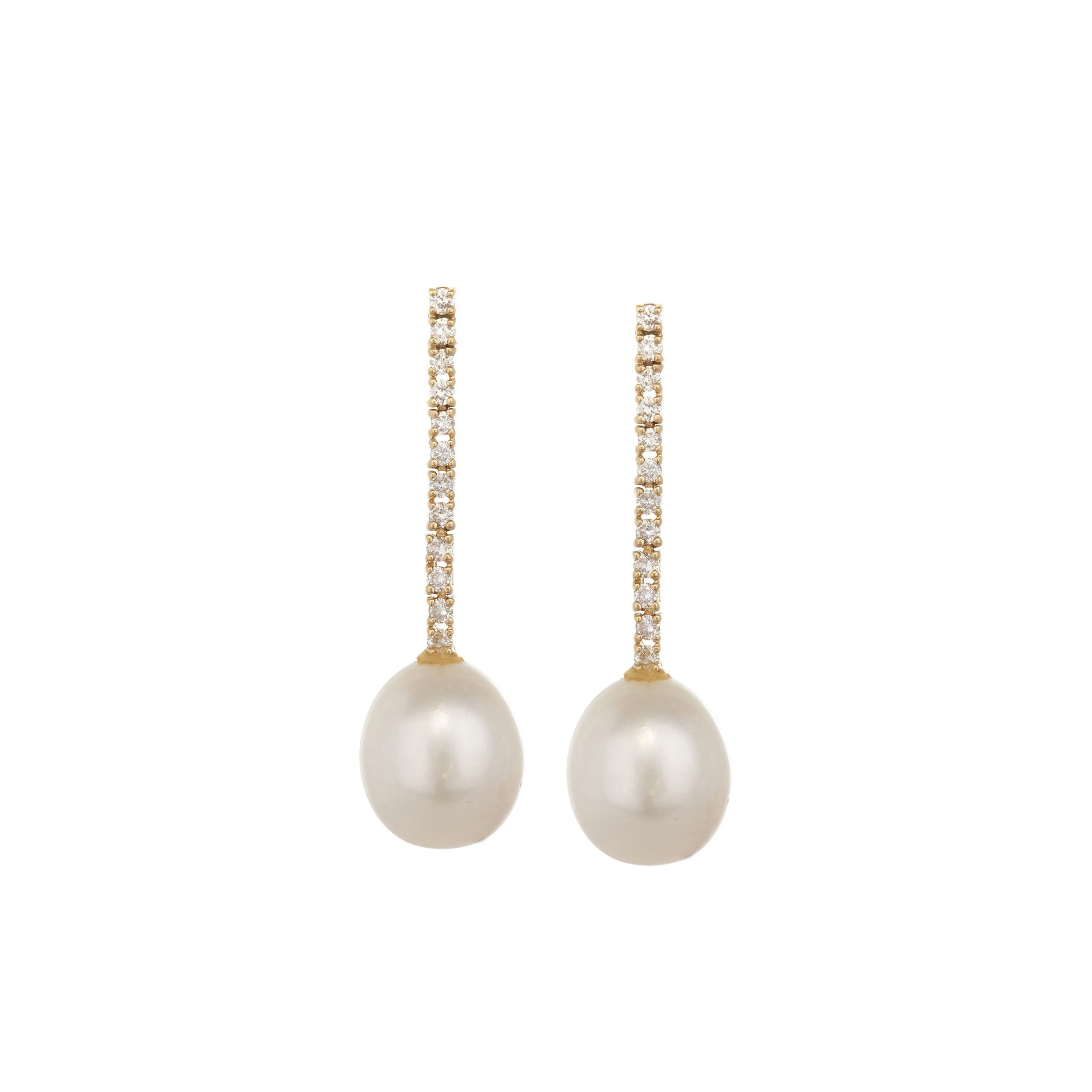 Brinco de ouro amarelo com pérolas (9,9mm) e 0,45ct de brilhantes. Medida 3,3cm.