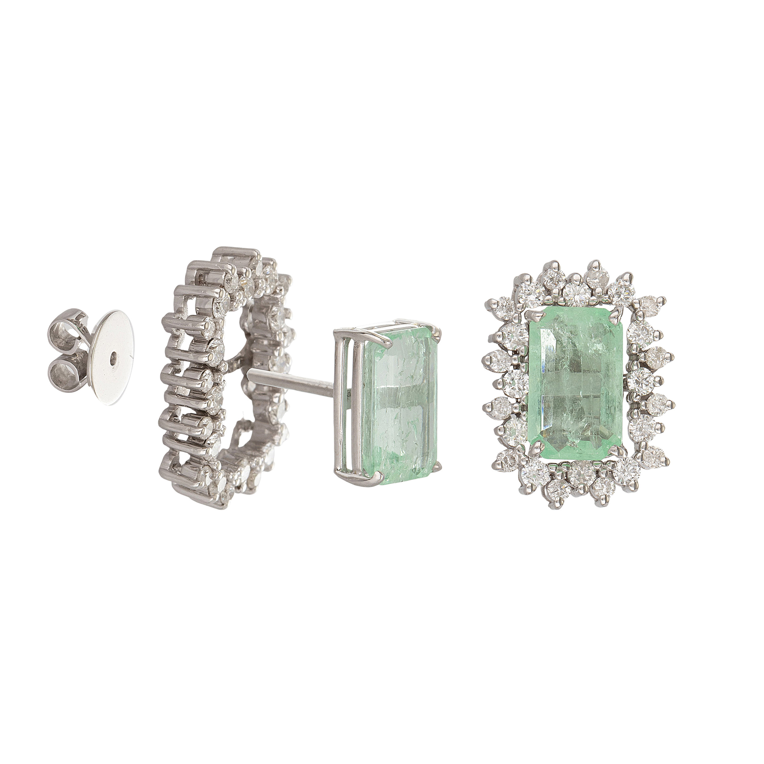 Brinco de ouro branco com 5,40ct de esmeraldas, 1,50ct de brilhantes I/SI-I1 e 9,0g. Medida 1,6cm.