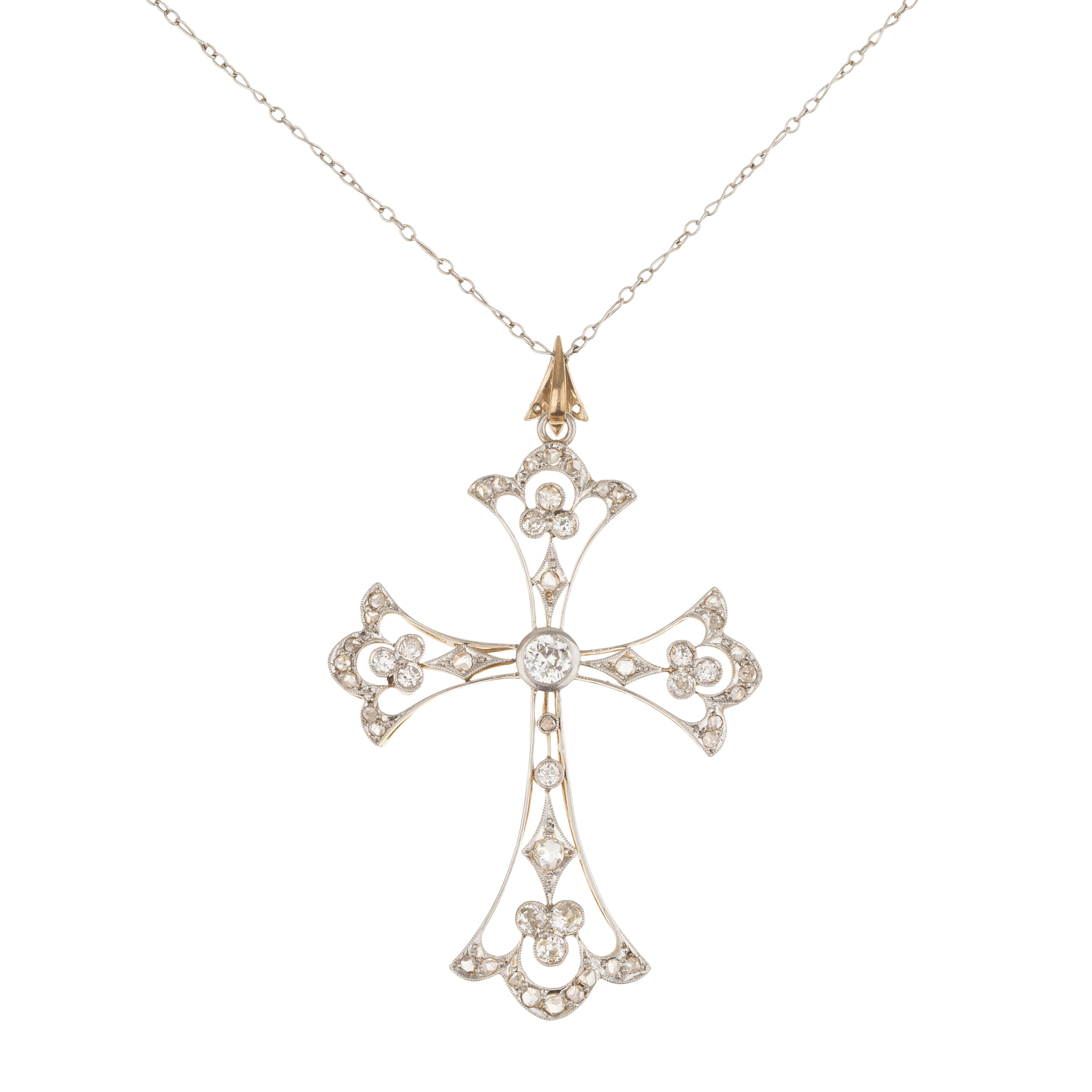 Corrente com pingente de ouro amarelo e platina, 1,25ct de diamantes (sendo 0,30ct de lapidação rose cut/0,95ct de lapidação Brasil) e 9,9g. Medida 6cm/38cm.