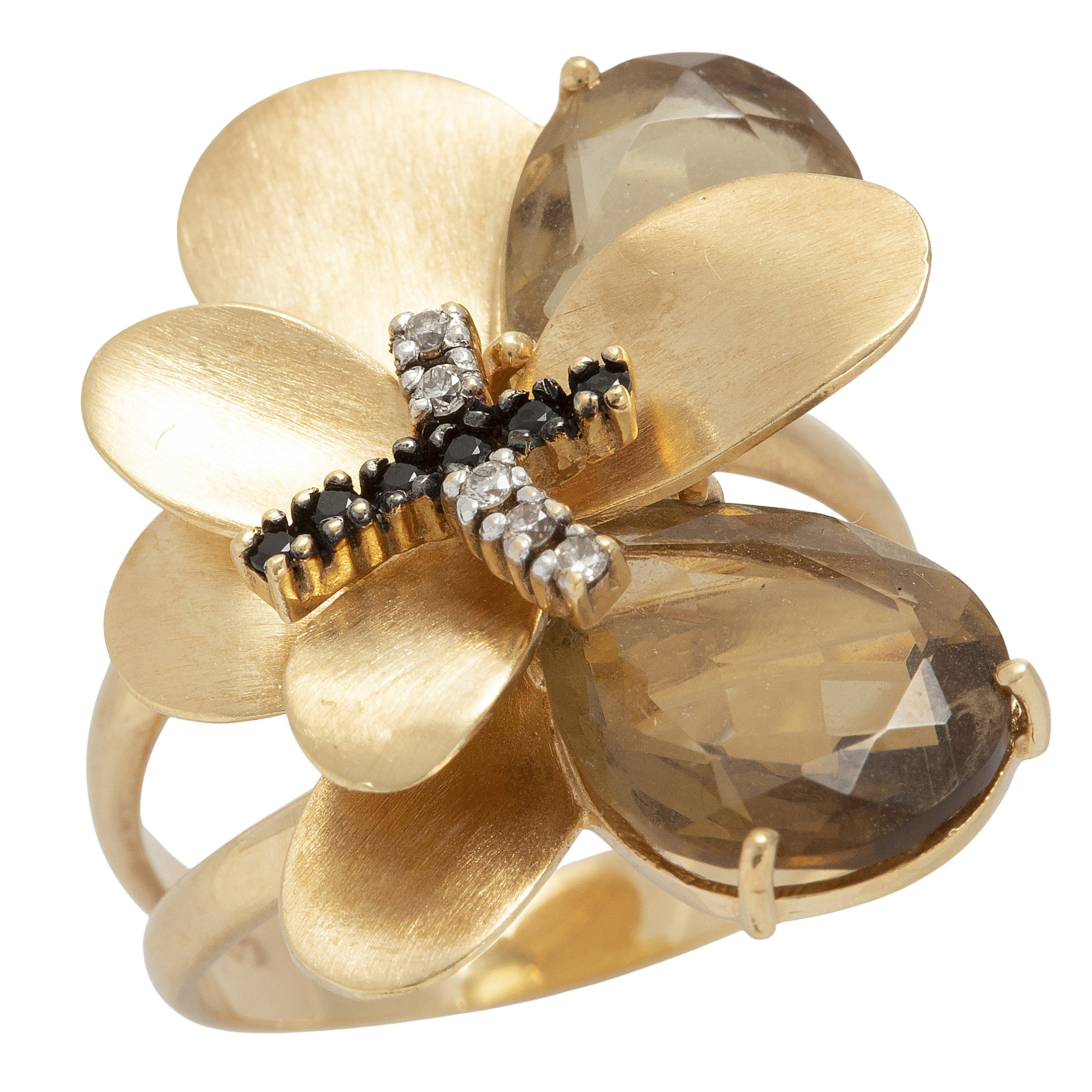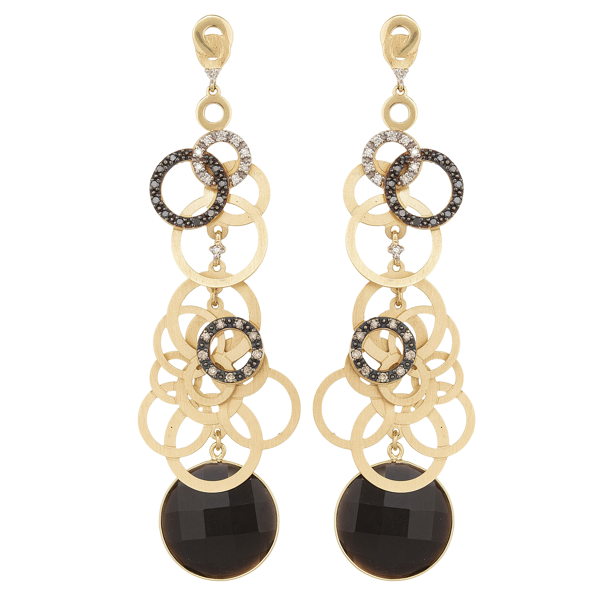 Brinco de ouro amarelo com 10,06ct de onix, 0,47ct de brilhantes (sendo 0,14ct de brilhantes castanhos/0,15ct de brilhantes brancos/0,18ct de brilhantes negros) e 12,0g. Medida 7cm.