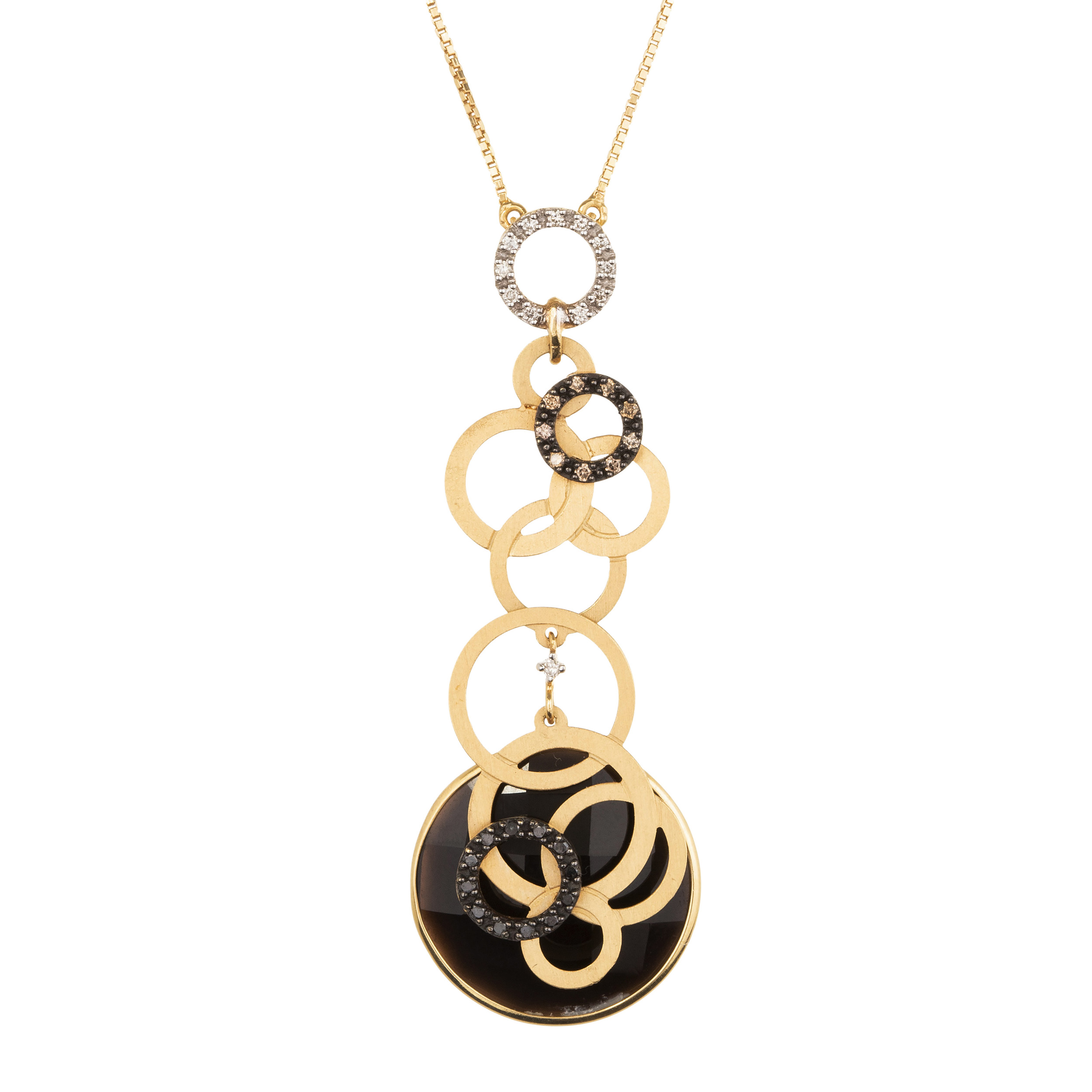 Corrente com pingente de ouro amarelo, 8,96ct de onix, 0,25ct de brilhantes (sendo 0,07ct de brilhantes castanhos/0,08ct de brilhantes brancos/0,10ct de brilhantes negros) e 8,2g. Medidas 5,5cm/53cm.