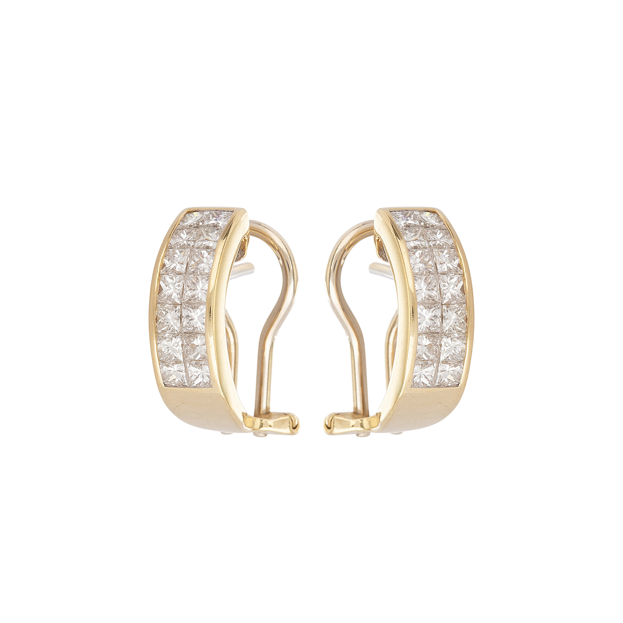 Brinco de ouro amarelo com 1,12ct de diamantes lapidação princess e 7,2g. Medida 1,8cm.