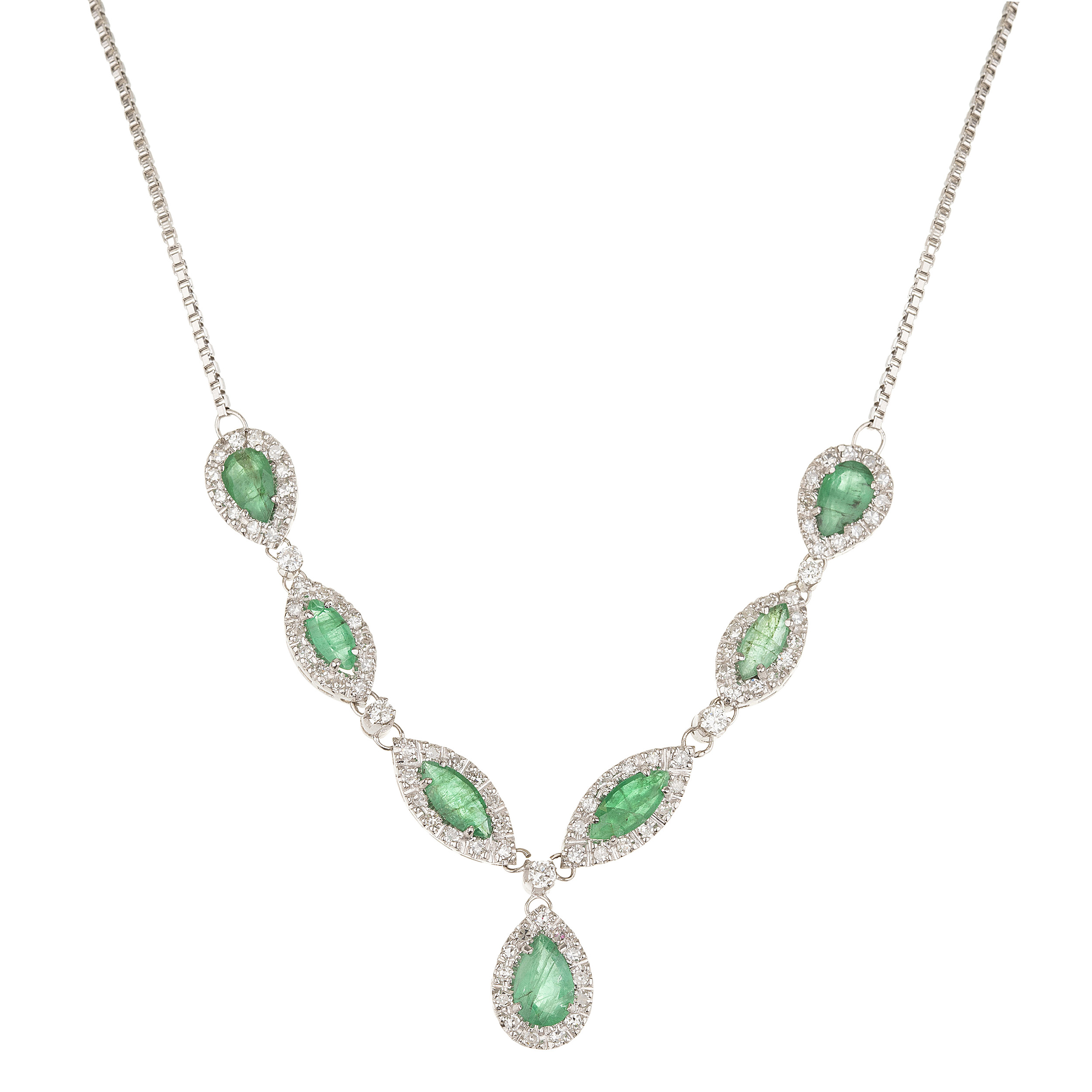 Gargantilha com pingente de ouro branco 14k, 5,96ct de esmeraldas, 2,10ct de brilhantes e 21,4g. Medidas 1,8cm/45cm.