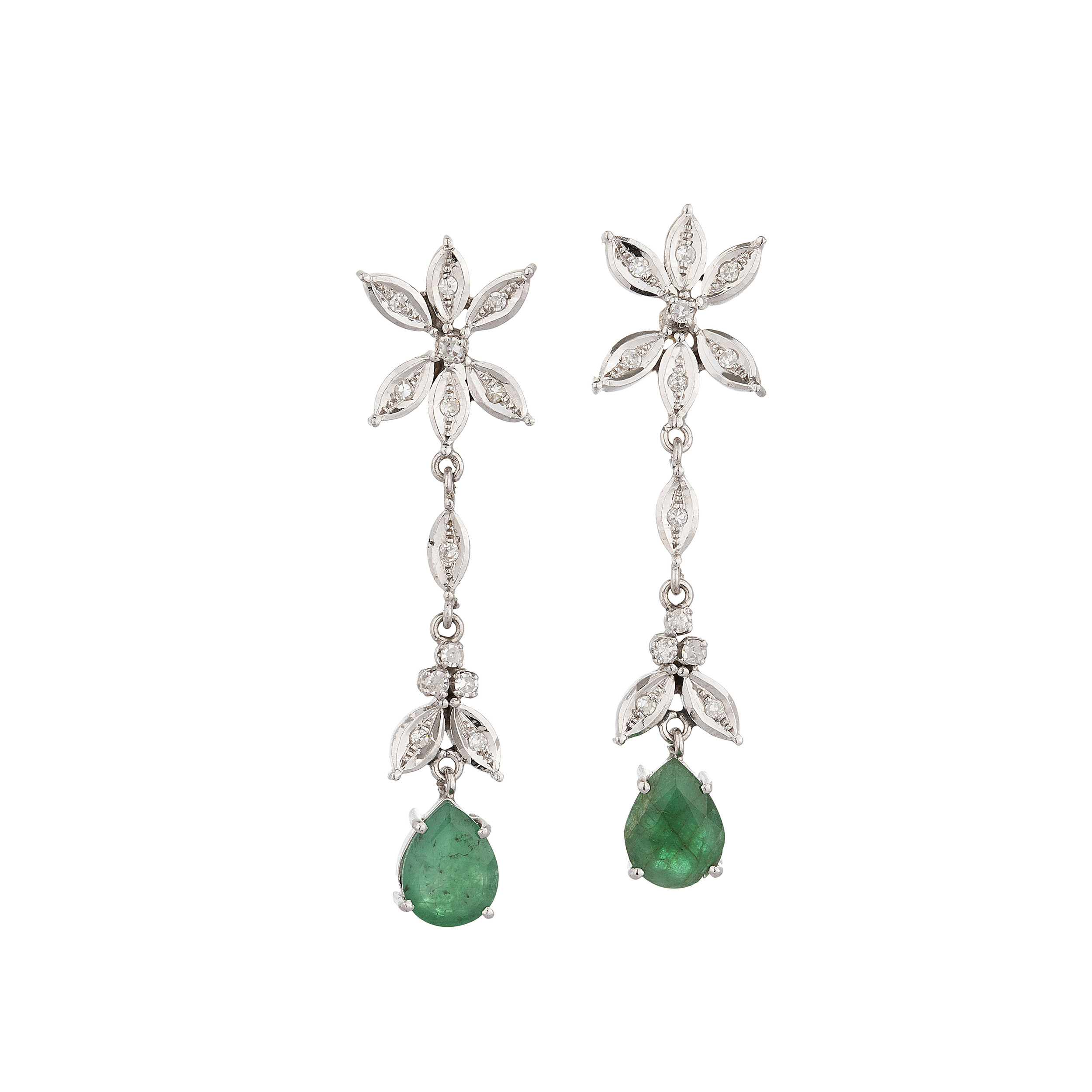 Brinco de ouro branco com 3,96ct de esmeraldas, 0,80ct de brilhantes e 14,3g. Medida 5,2cm.