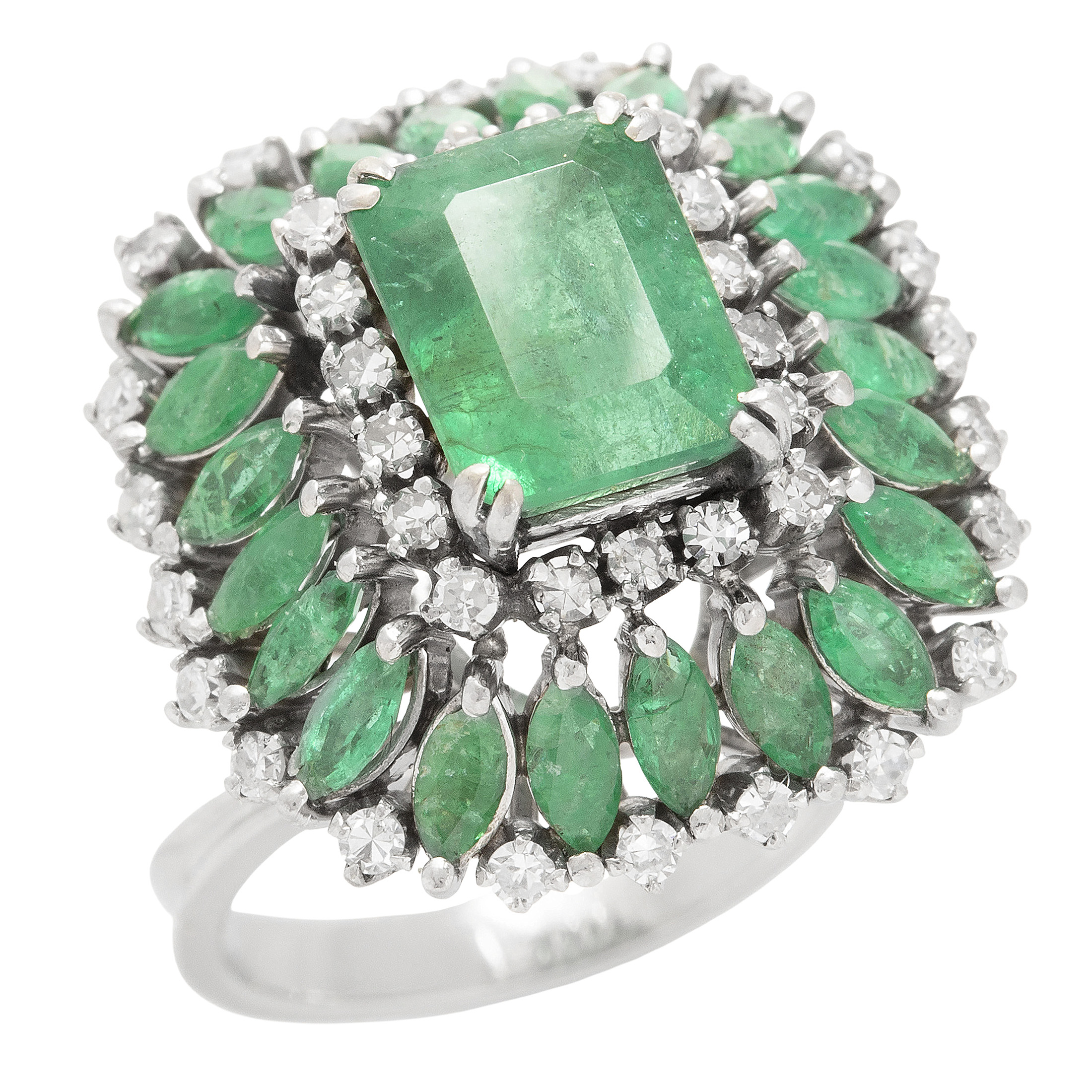 Anel de platina com esmeraldas, 0,40ct de brilhantes e 11,4g. Medida 16.