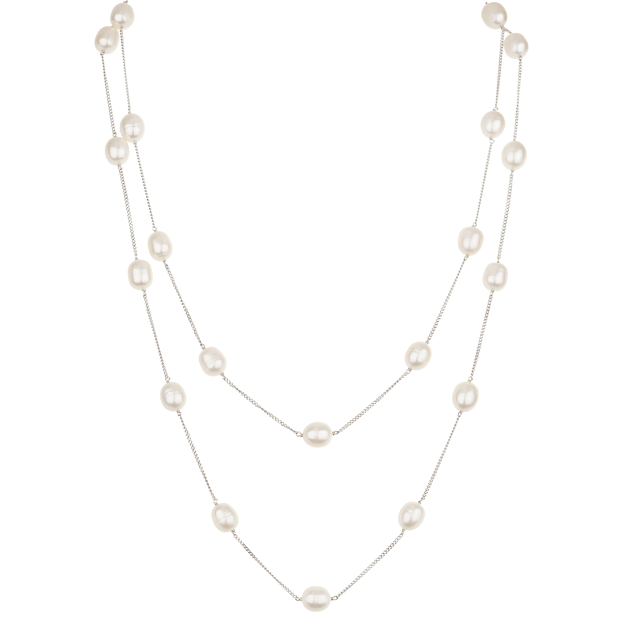 Colar de ouro branco com pérolas (7,9mm) e 29,1g. Medida 105cm.