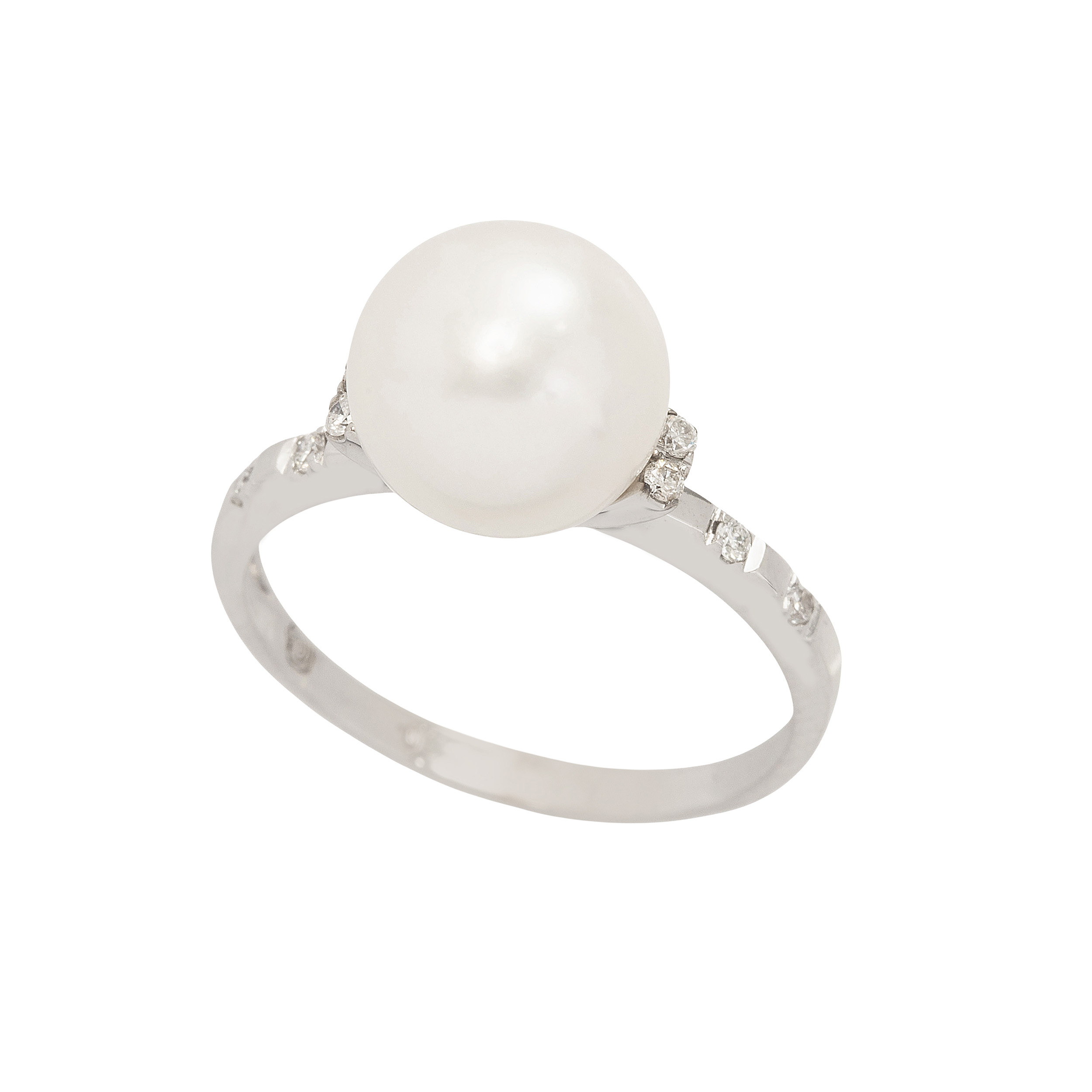 Anel de ouro branco com pérola (10mm) e 0,10ct de brilhantes. Medida 18.