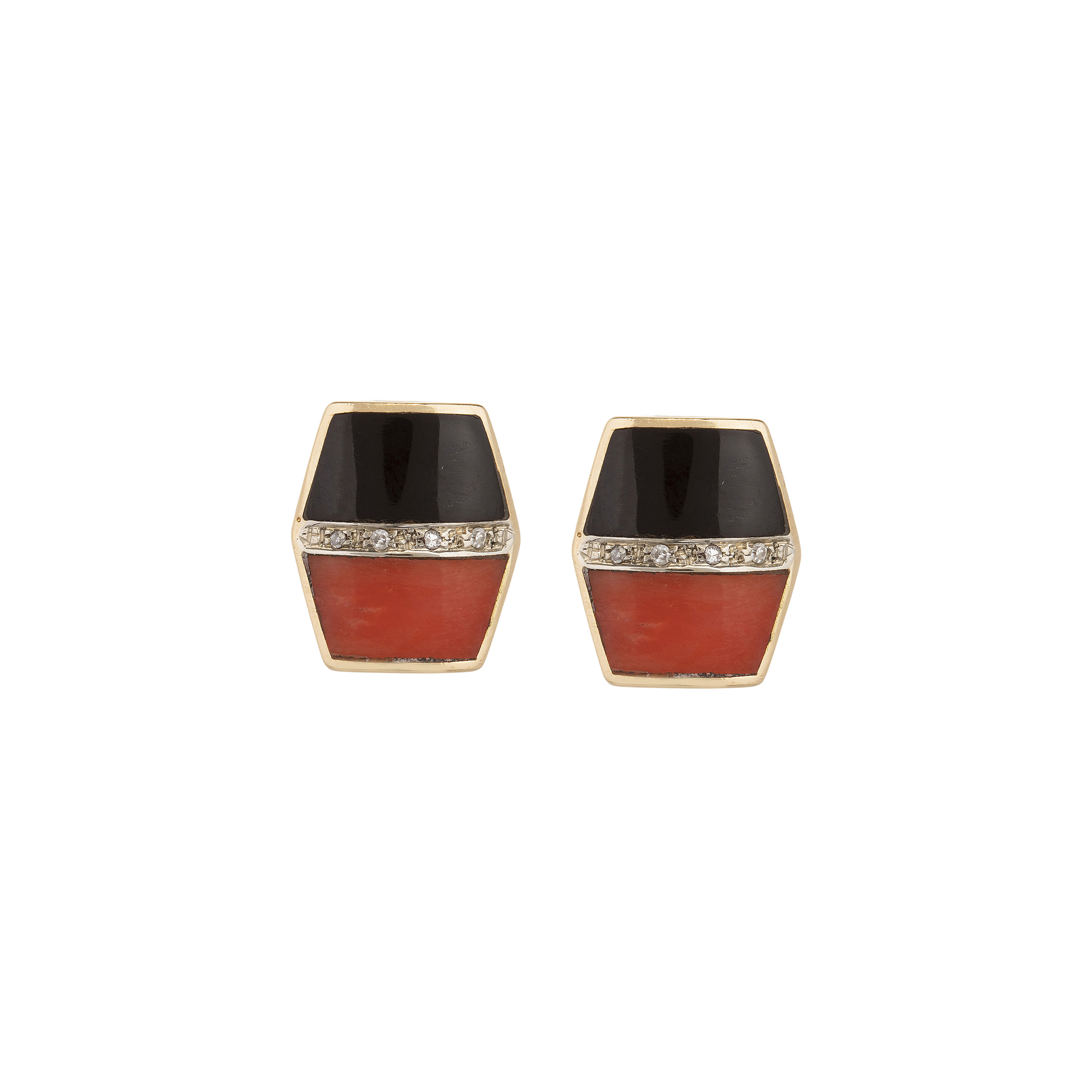 Brinco de ouro amarelo com onix, corais, 0,04ct de brilhantes e 7,6g. Medida 1,4cm.