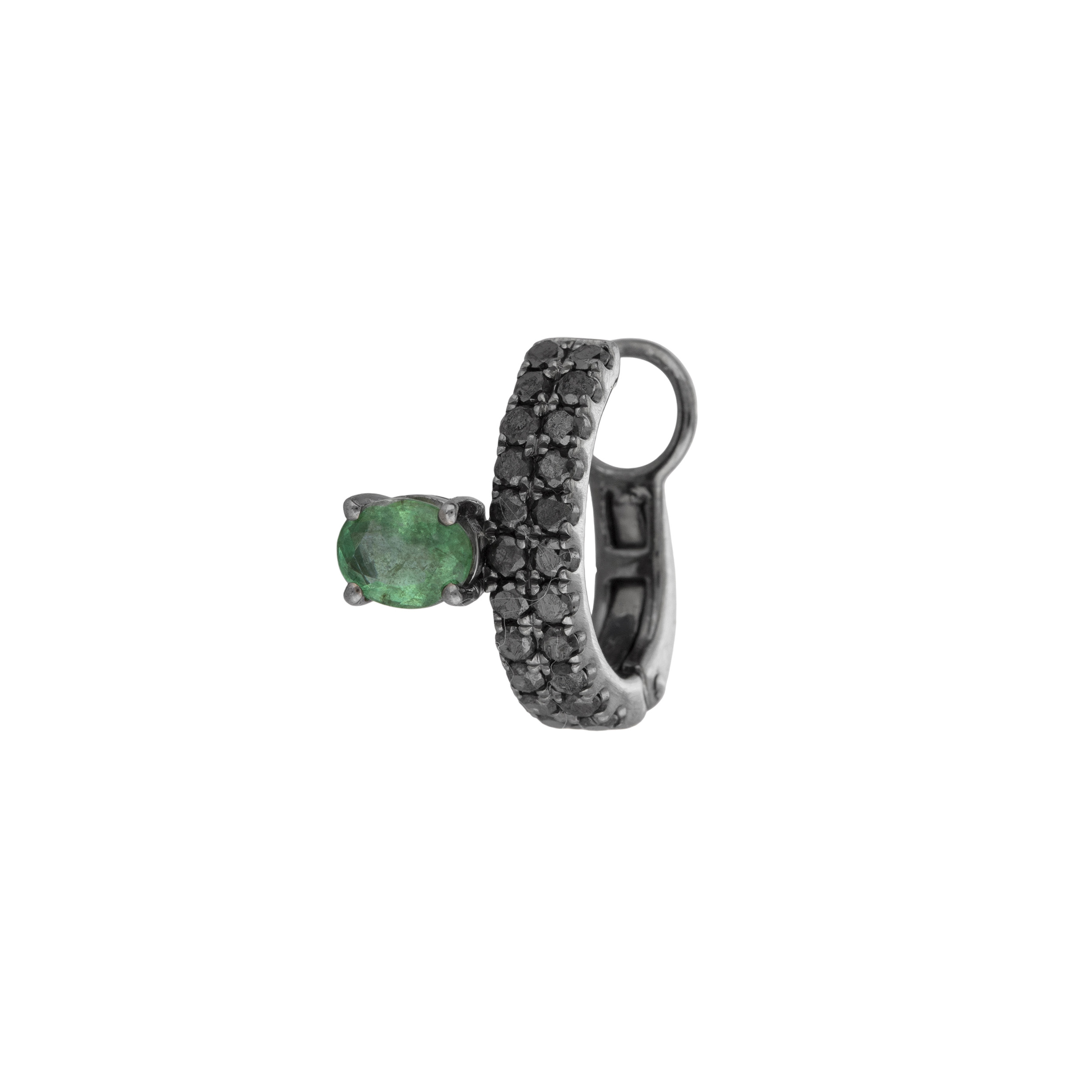 Piercing de ouro branco com ródio negro, 0,30ct de esmeralda e 0,35ct de brilhantes negros. Medida 1,9cm.