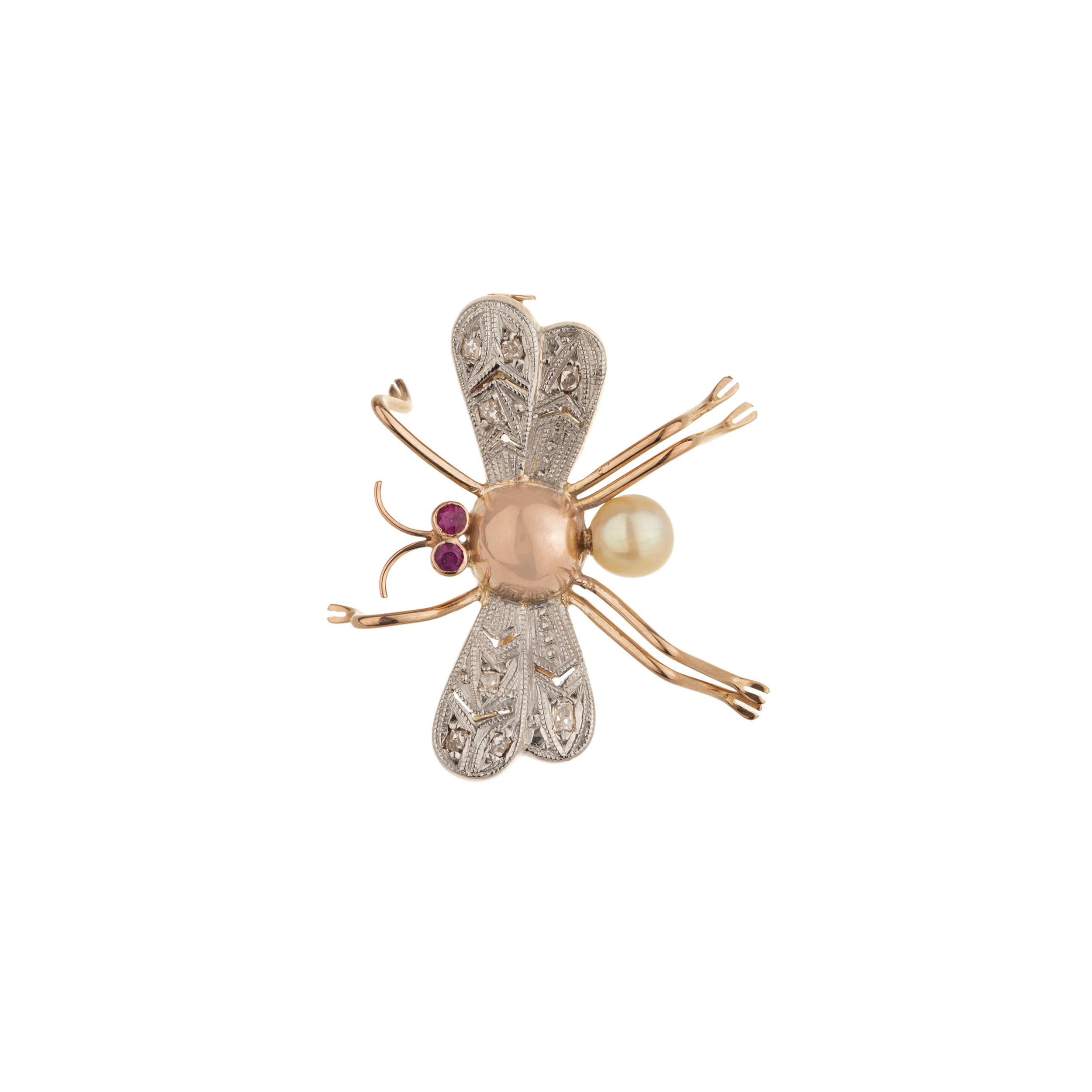 Broche de ouro amarelo e prata com pérola (5mm), rubis sintéticos e 0,05ct de diamantes rose cut. Medida 2,4x2,8cm.