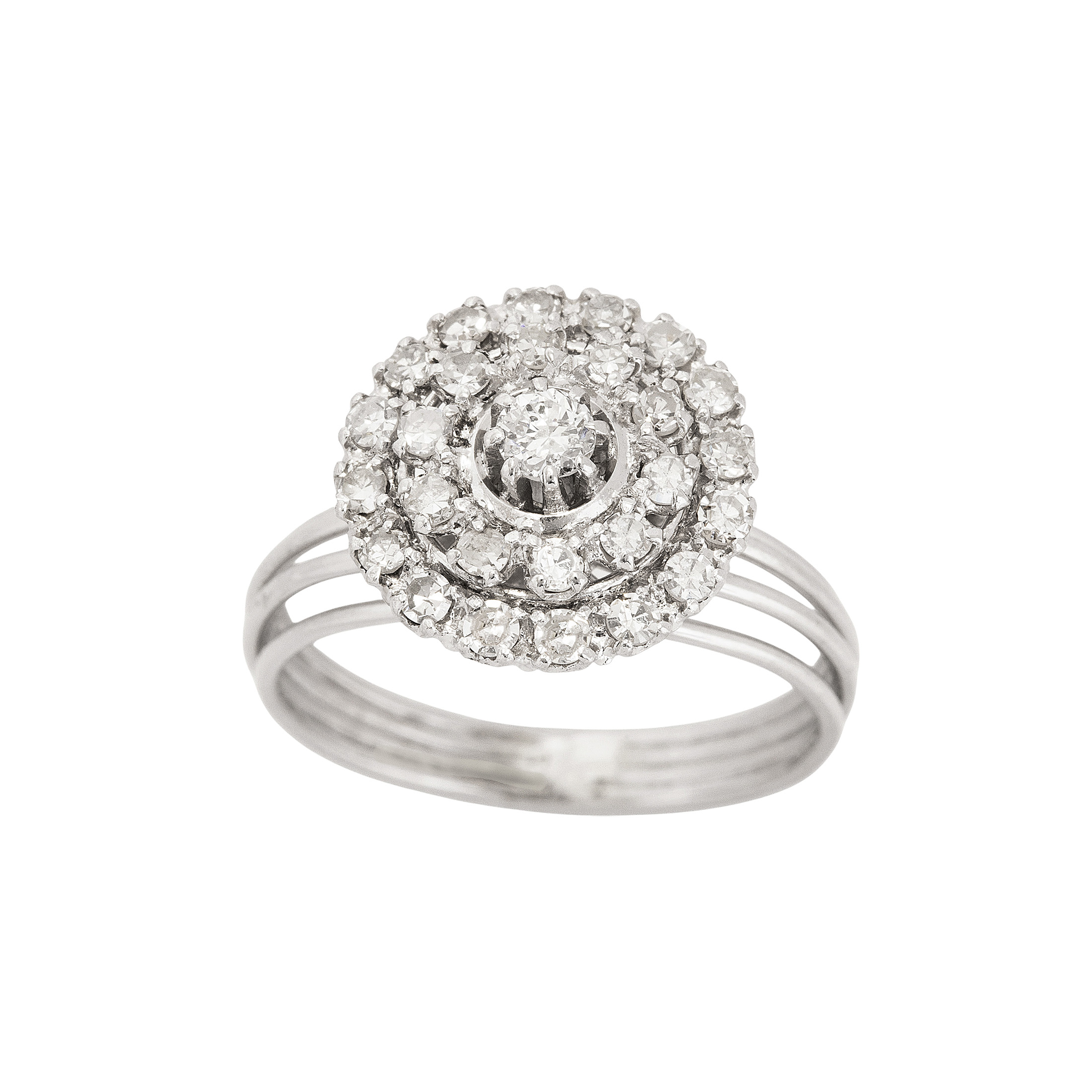 Anel chuveiro de platina com 1,10ct de brilhantes. Medida 17.