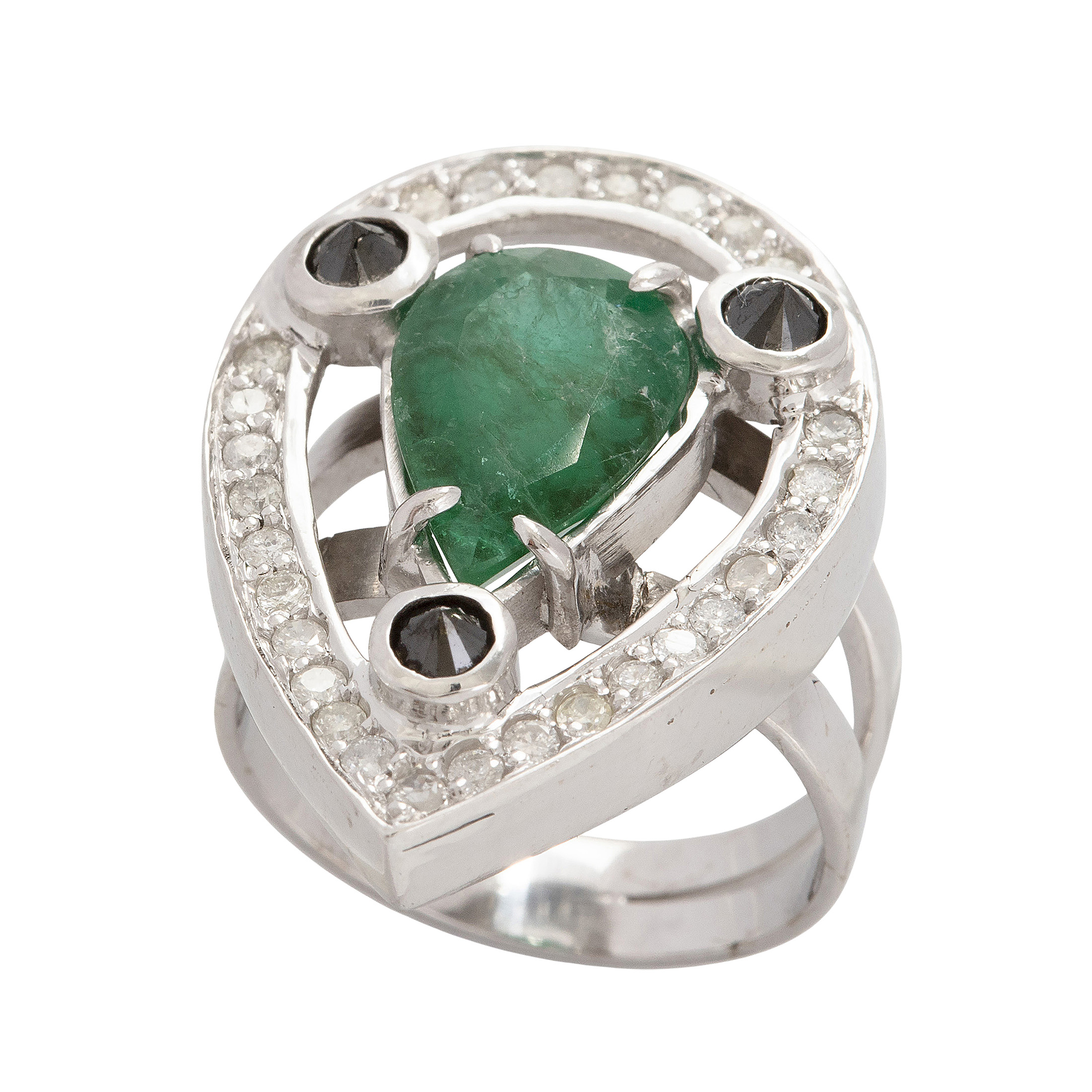 Anel de ouro branco com 3,50ct de esmeralda, 0,95ct de brilhantes (sendo 0,35ct de brilhantes negros/0,60ct de brilhantes brancos) e 10,1g. Medida 14.