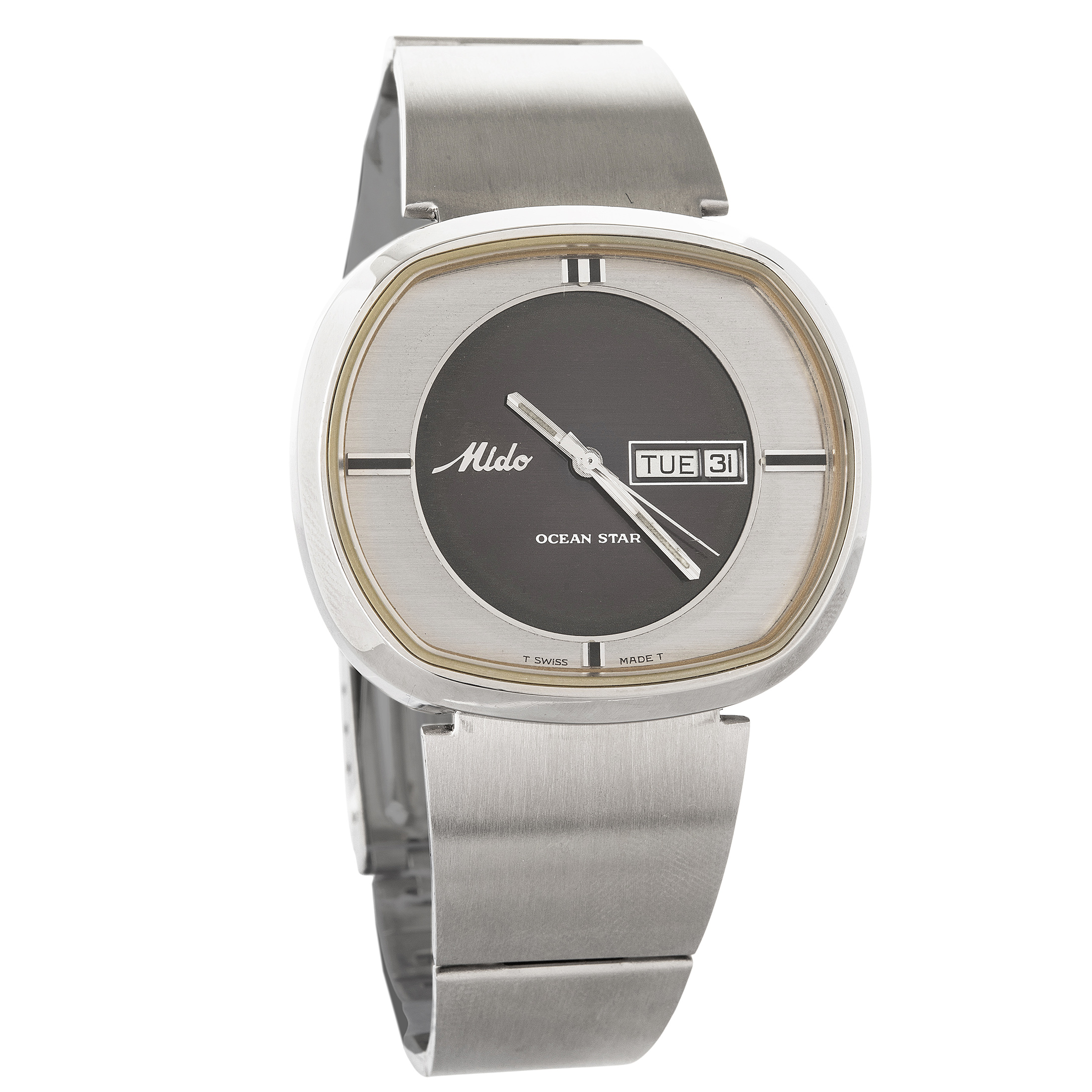 MIDO. Relógio Ocean Star de aço com movimento automático, calendário, vidro de cristal mineral, anos 80. Caixa 42mm. Pulseira 19cm.