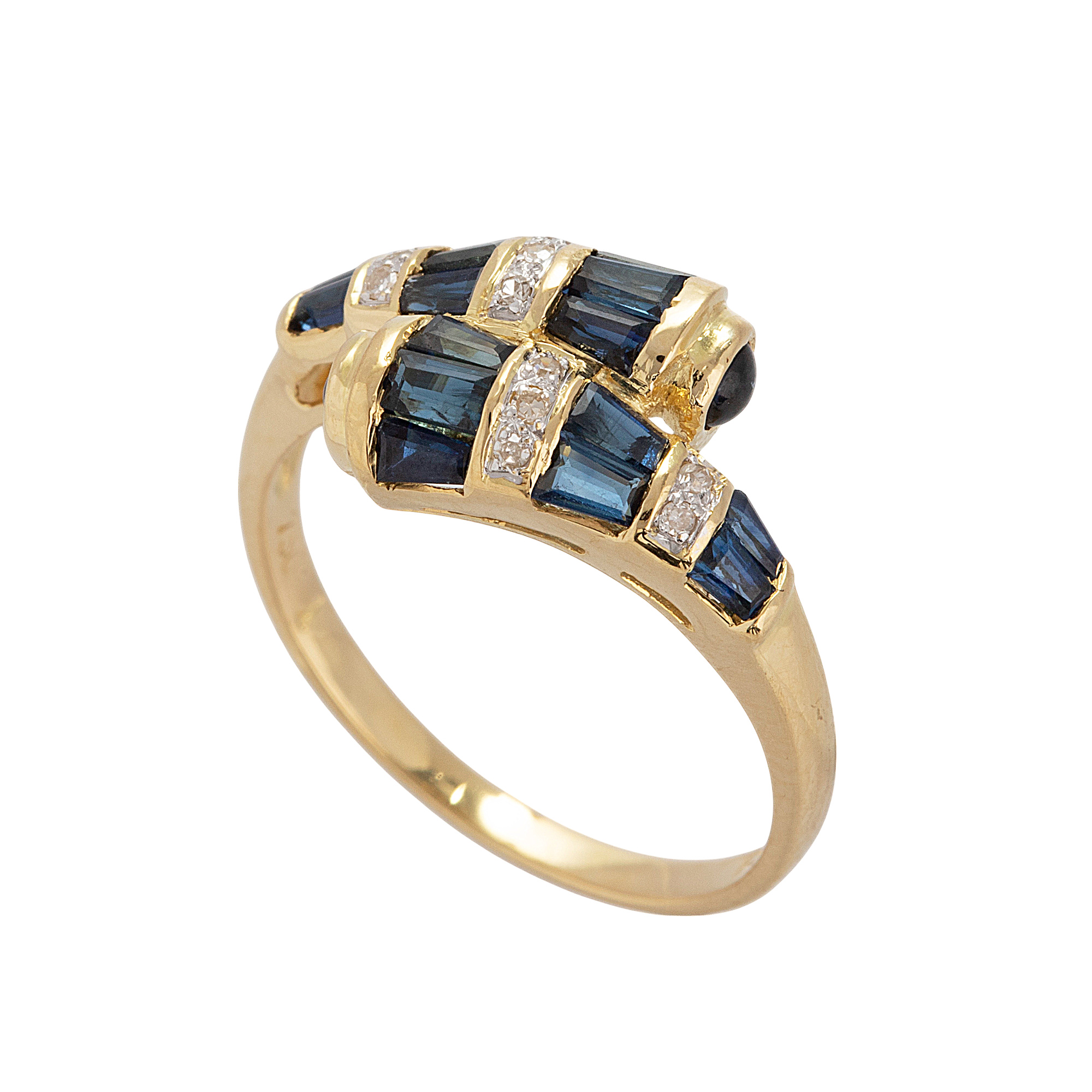 Anel de ouro amarelo com safiras e 0,04ct de brilhantes. Medida 16.