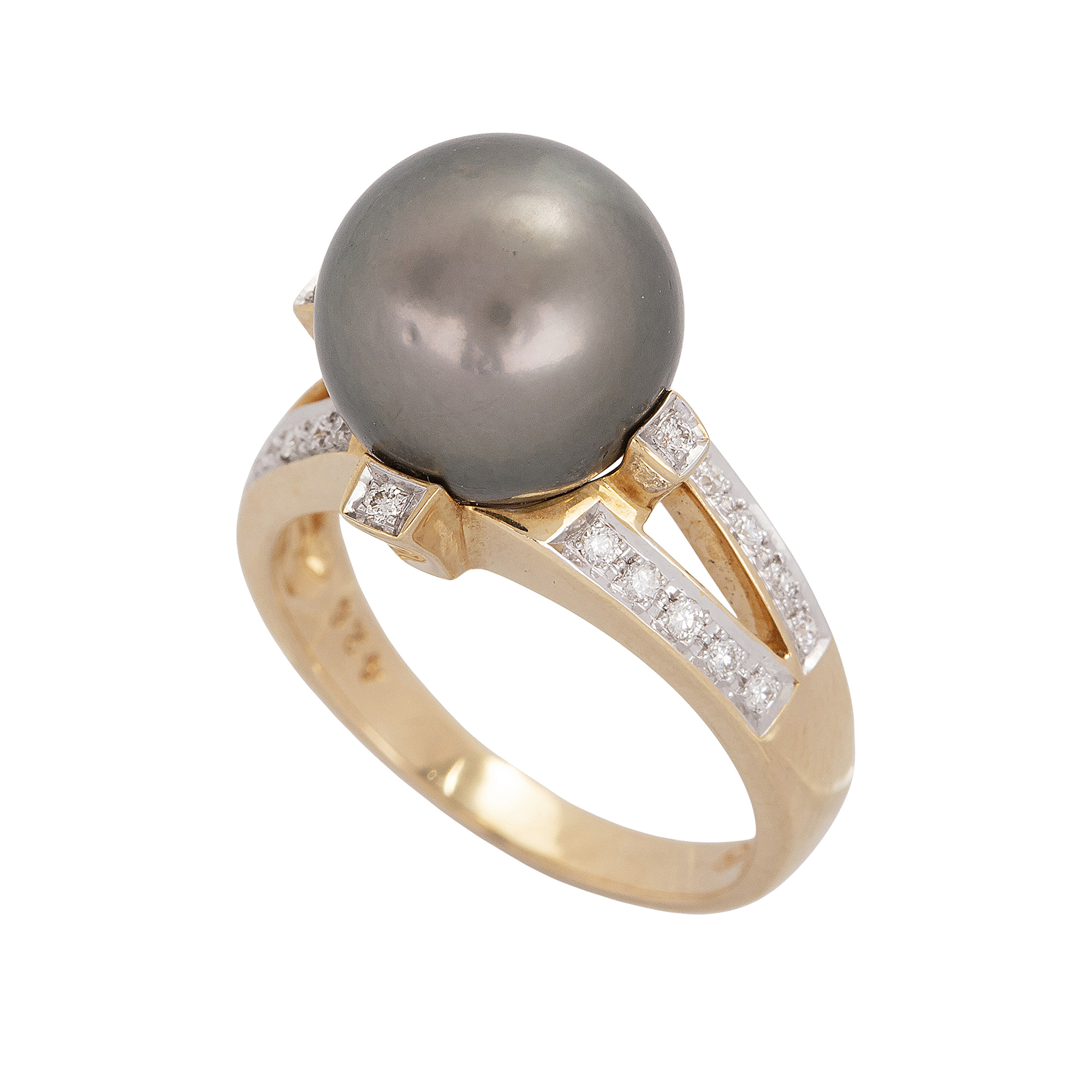 Anel de ouro amarelo com pérola (11mm), 0,20ct de brilhantes e 7,8g. Medida 17.