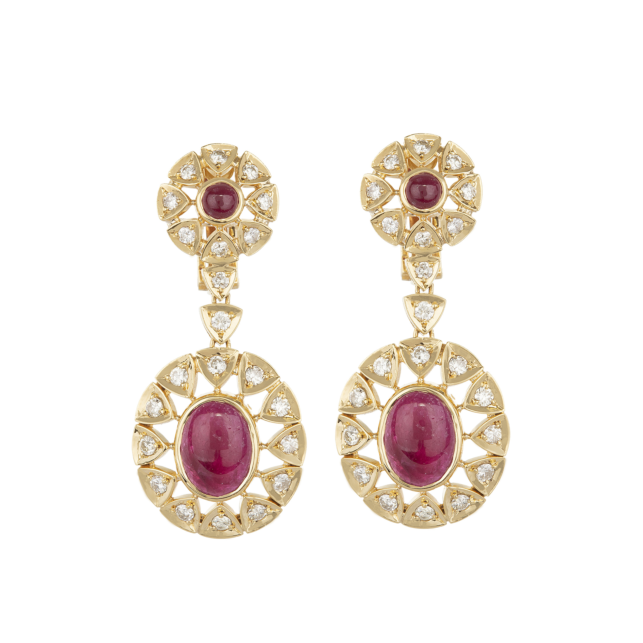 Brinco de ouro amarelo com rubis, 1,70ct de brilhantes I/VS-SI e 16,2g. Medida 4,1cm.