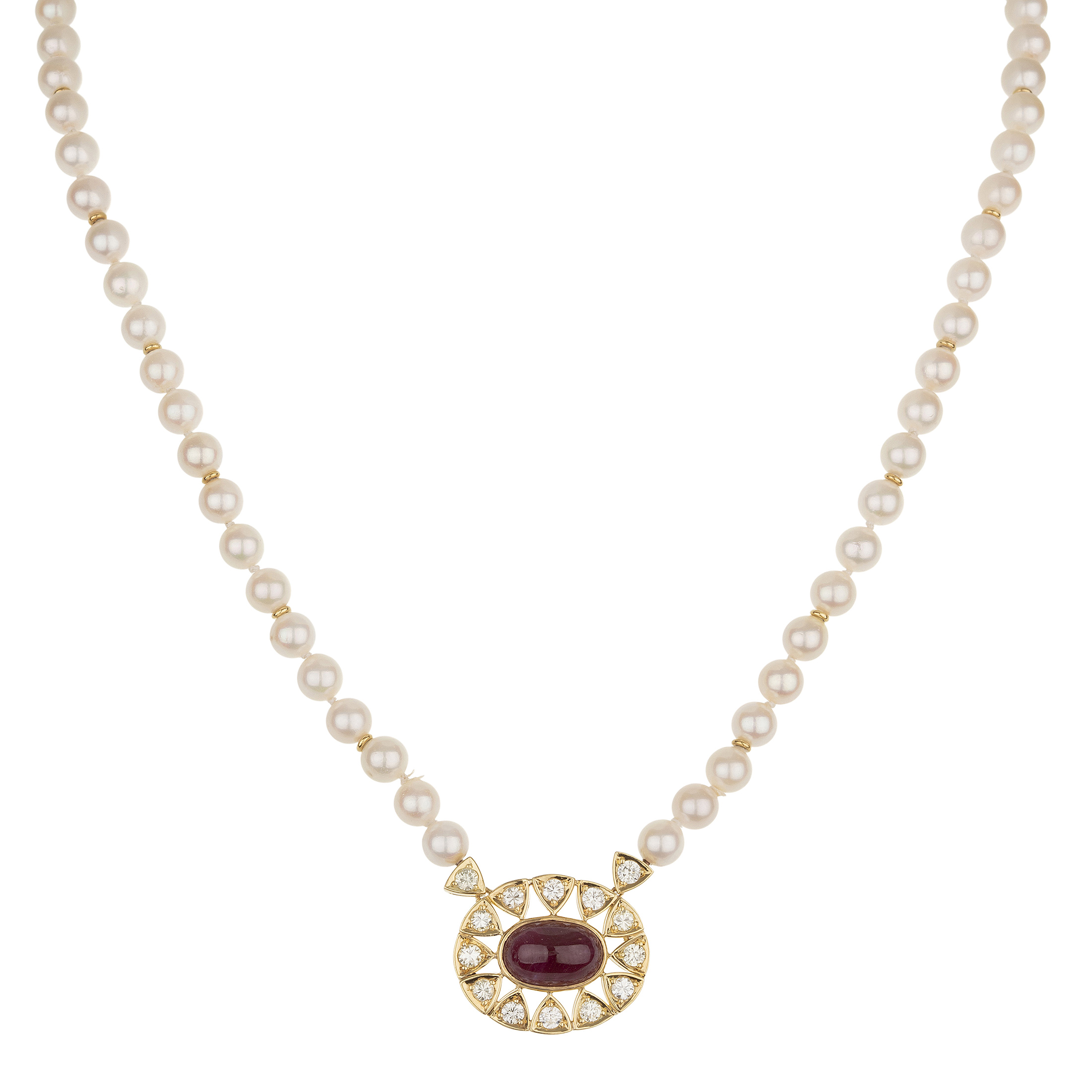 Colar de pérolas (6mm) com ouro amarelo, rubi, 1,15ct de brilhantes e 26,8g. Medida 45cm.