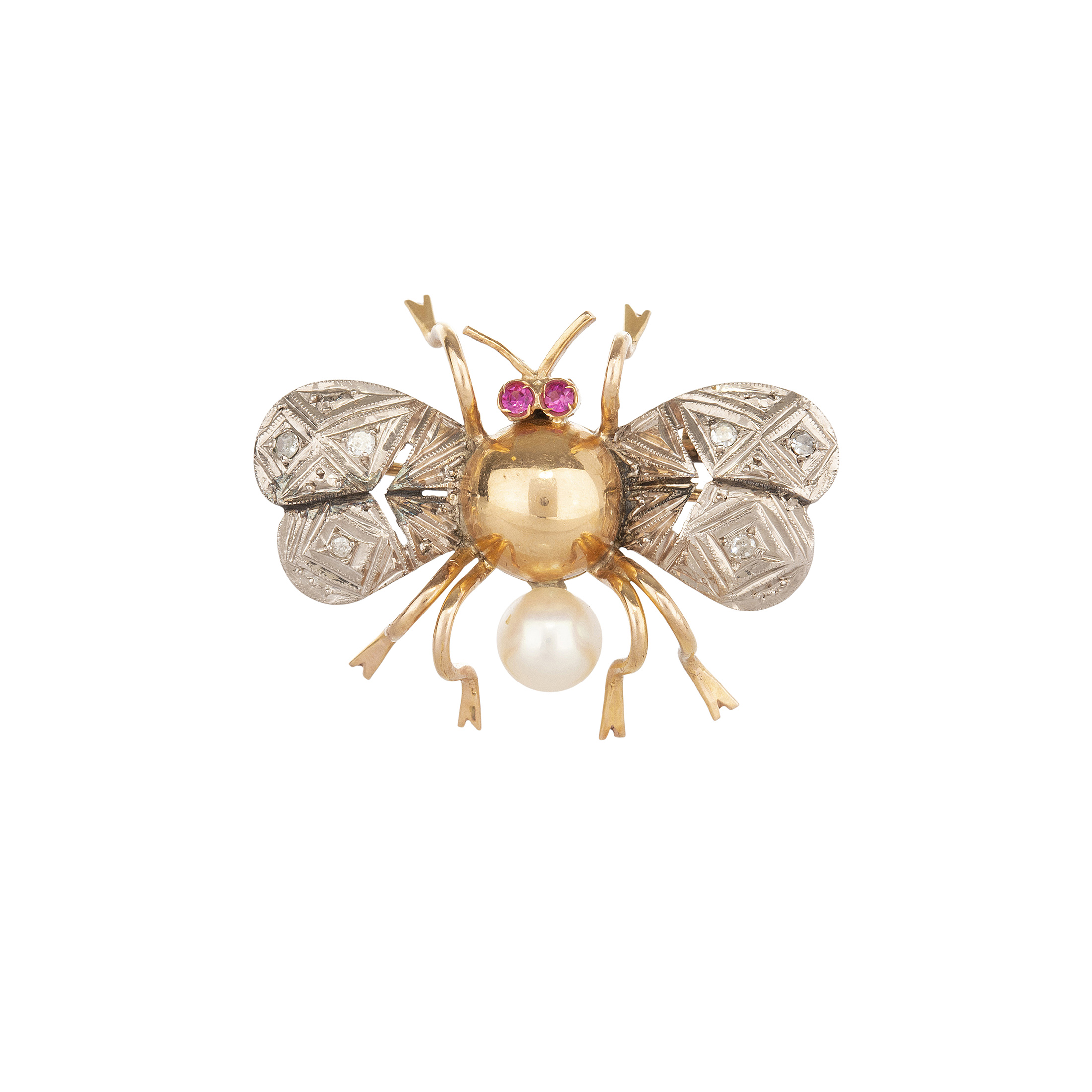 Broche de ouro amarelo e branco com pérola (6mm), rubis sintéticos, 0,04ct de brilhantes e 6,7g. Medida 2,5cm.