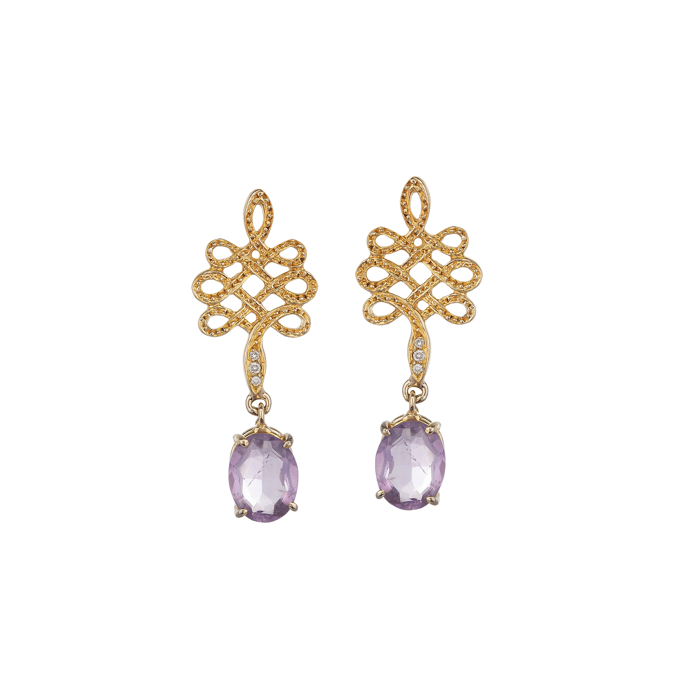 Brinco de ouro amarelo com ametistas, 0,04ct de brilhantes e 8,1g. Medida 3,4cm.