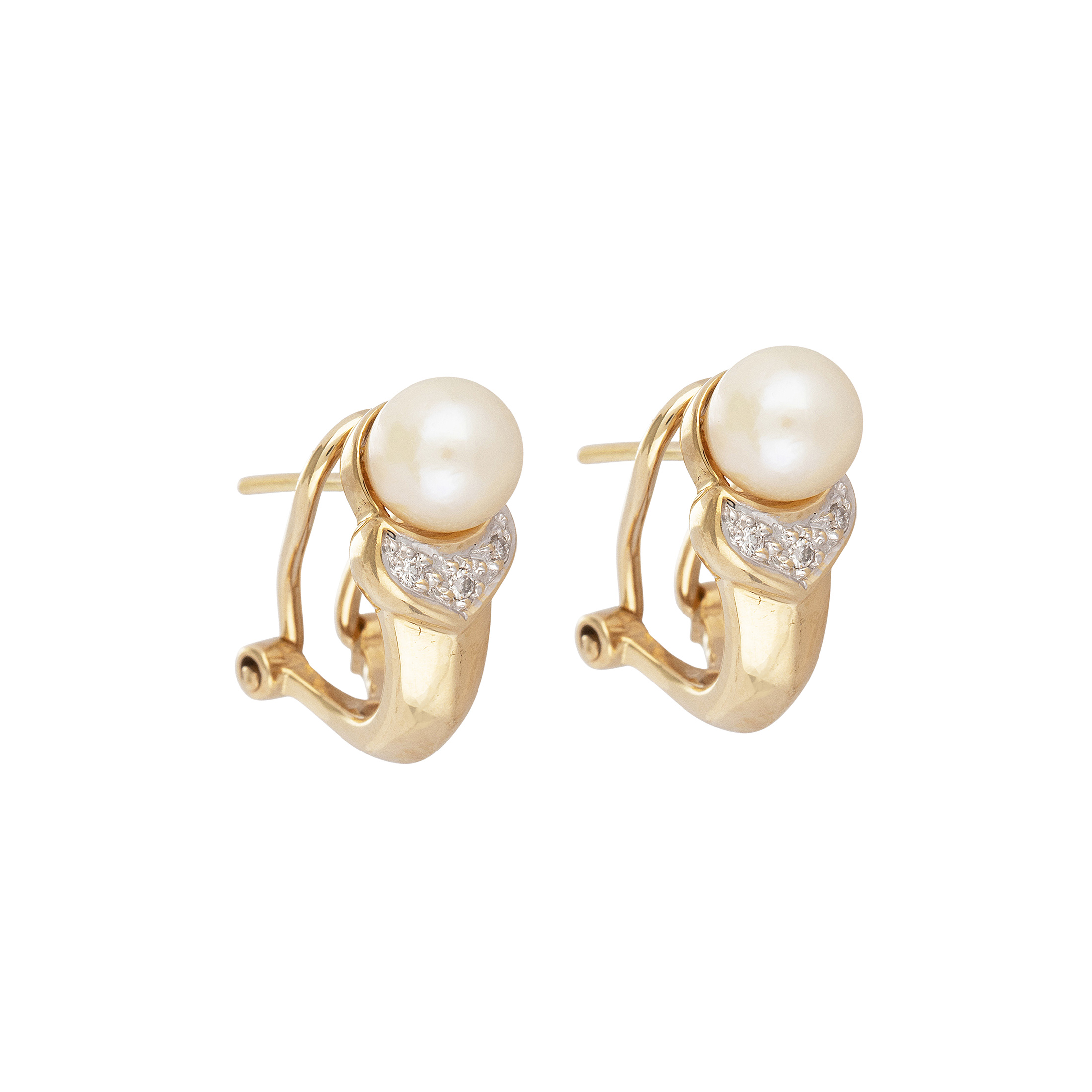 Brinco de ouro amarelo com pérolas (6mm) e 0,04ct de brilhantes. Medida 1,8cm.