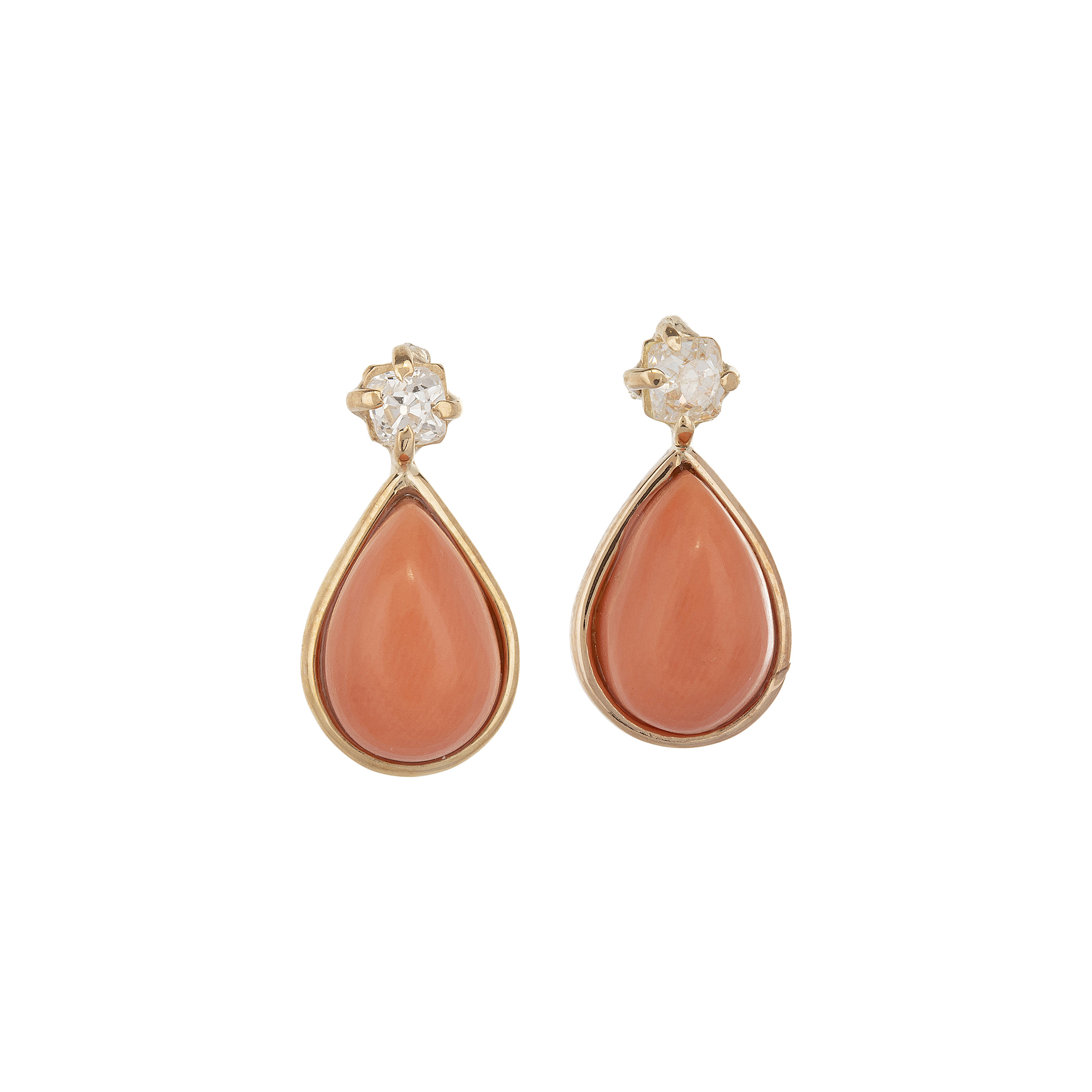 Brinco de ouro amarelo com corais e 0,40ct de diamantes lapidação Brasil. Medida 1,8cm.