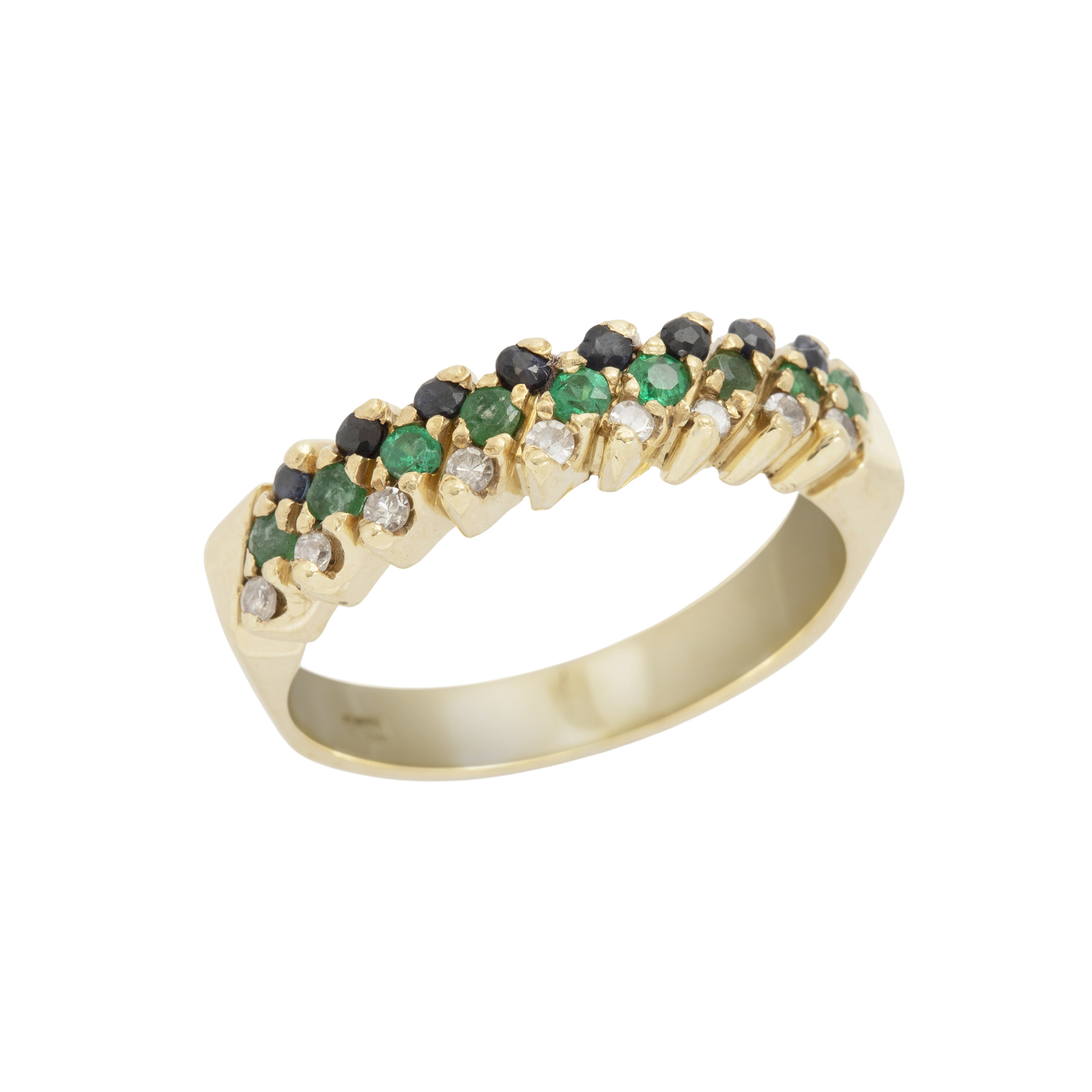 Anel de ouro amarelo com safiras, esmeraldas e 0,09ct de brilhantes. Medida 18.