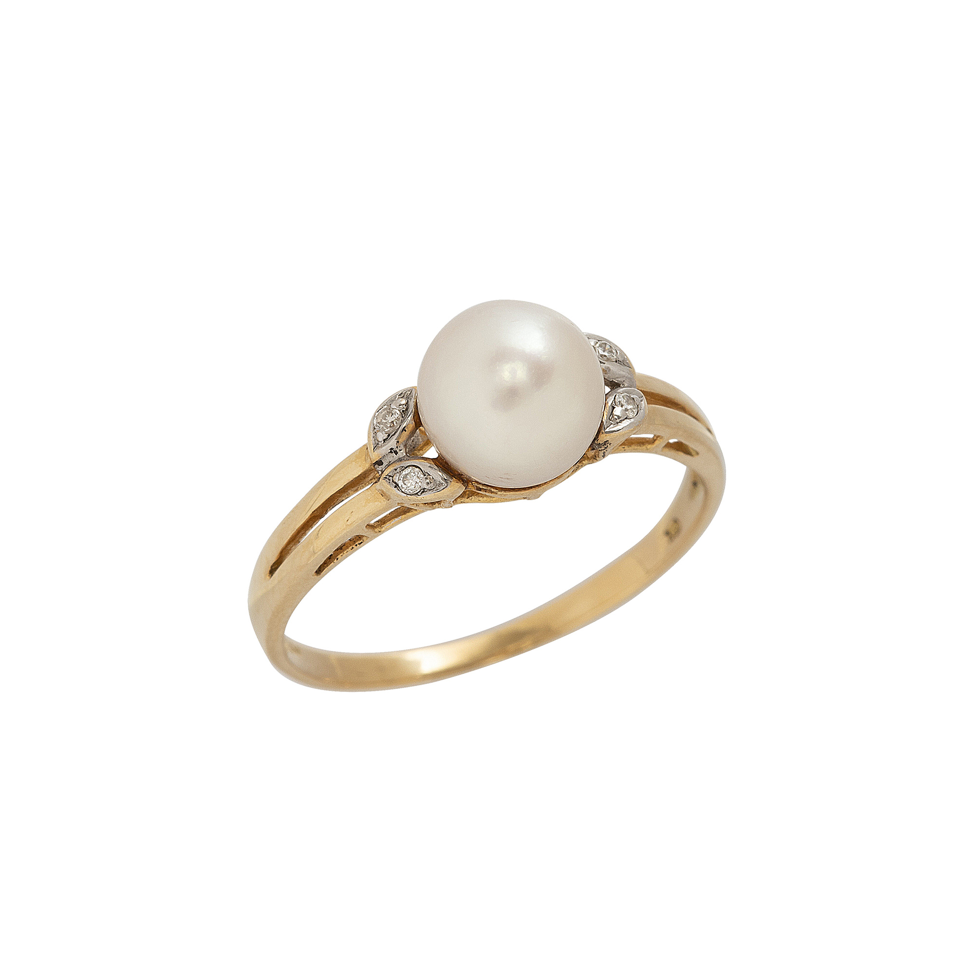 Anel de ouro amarelo com pérola (6,2mm) e 0,02ct de brilhantes. Medida 16.