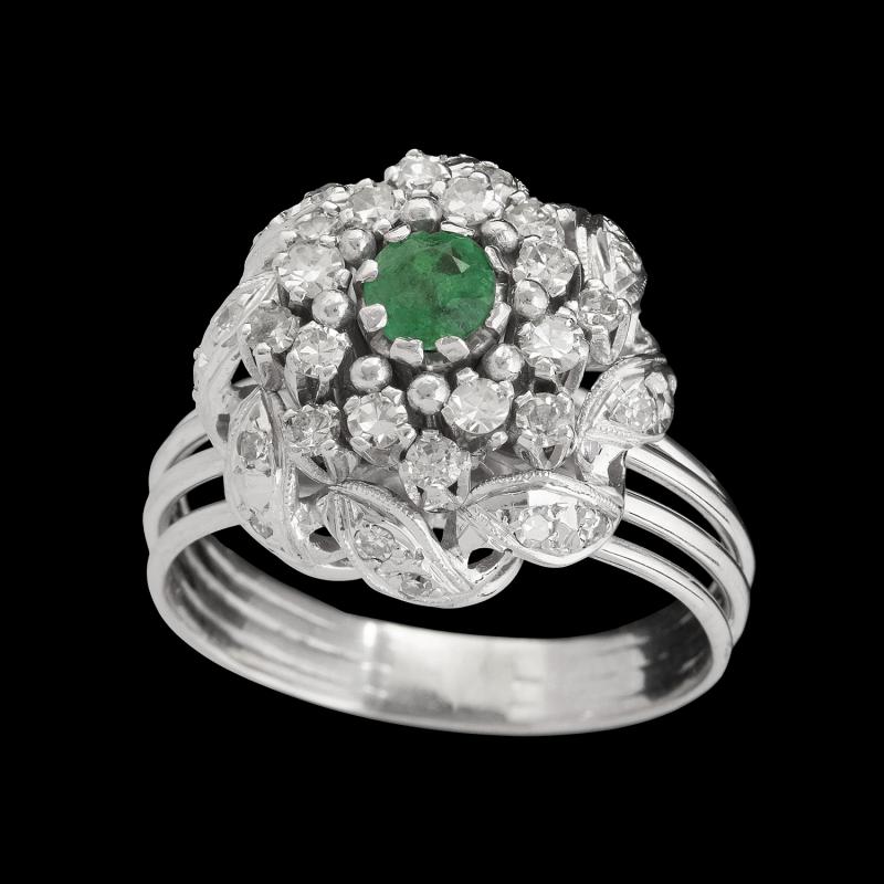 Anel de ouro branco 14k com esmeralda, 0,70ct de brilhantes e 7,7g. Medida 22.
