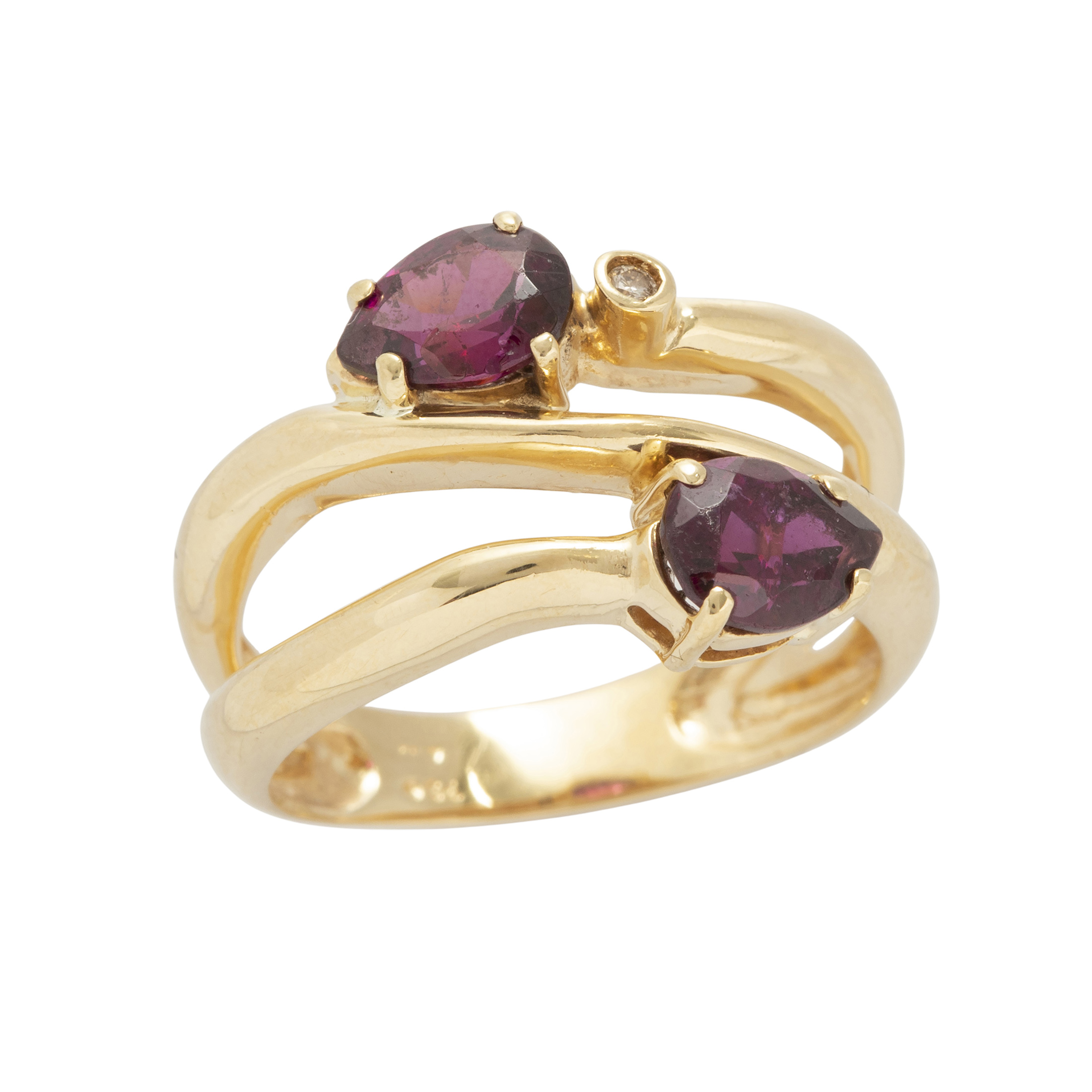 Anel de ouro amarelo com rubelitas e 0,02ct de brilhante. Medida 17.