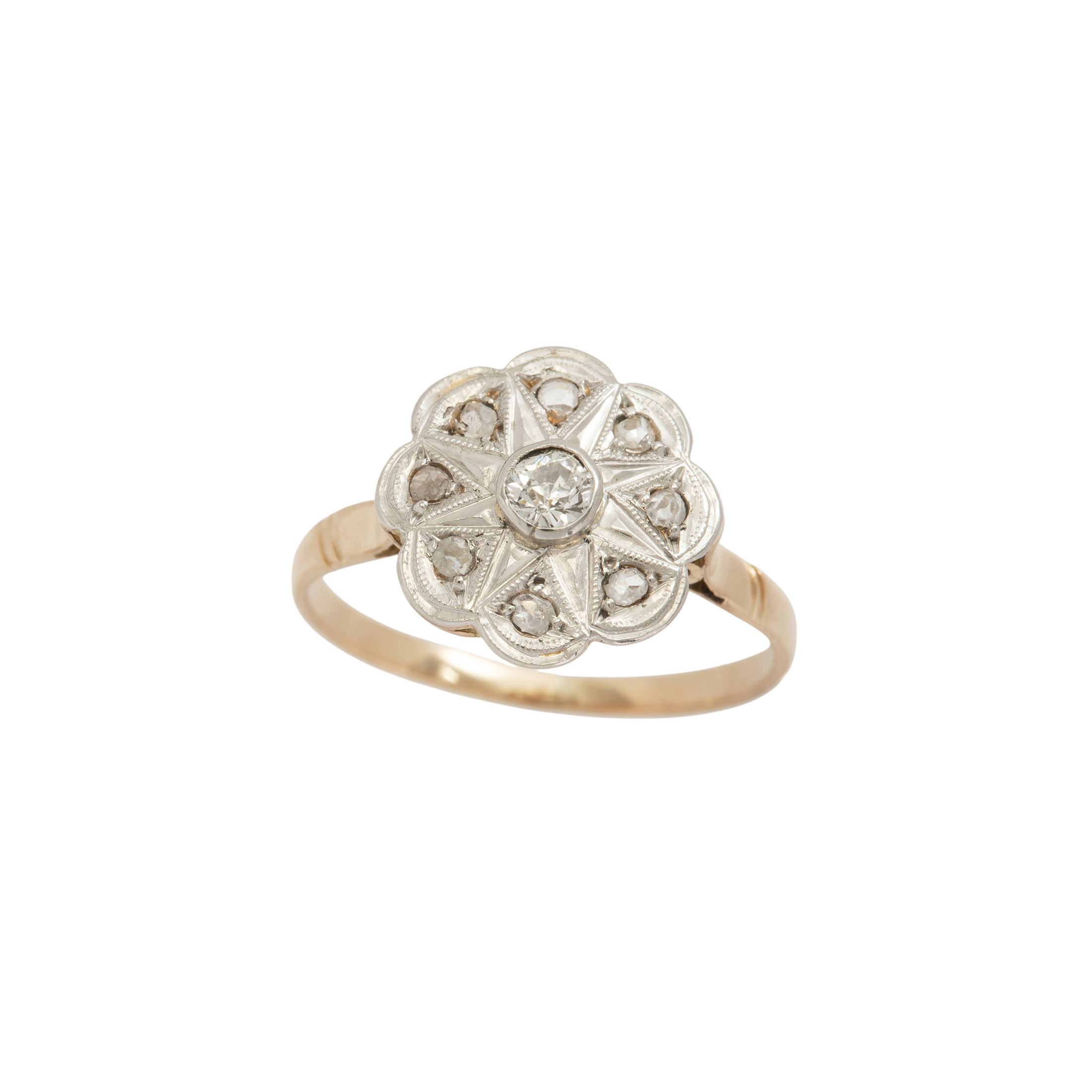 Anel de ouro amarelo e platina com 0,16ct de brilhantes. Medida 13.
