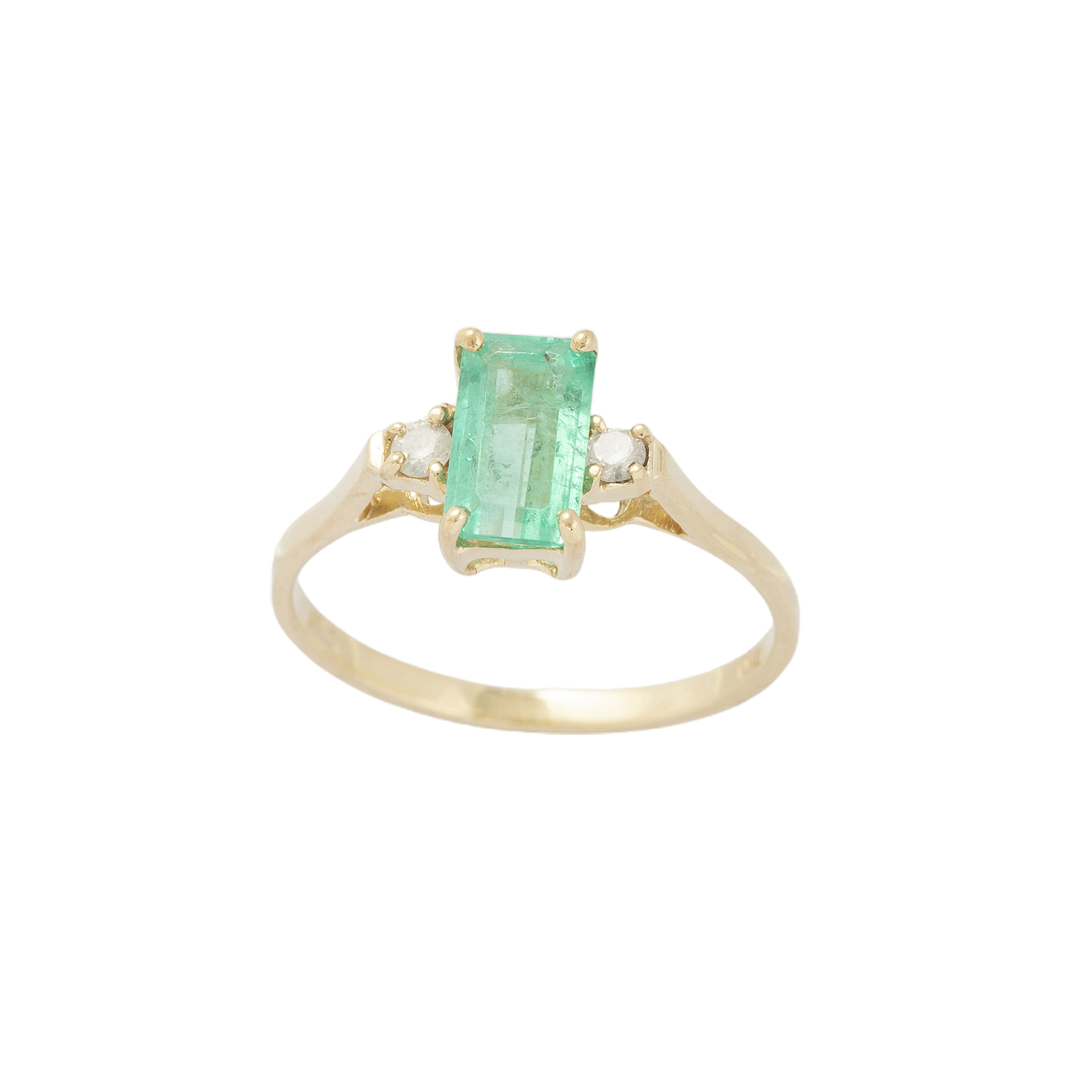 Anel de ouro amarelo com 0,80ct de esmeralda e 0,08ct de brilhantes. Medida 18.