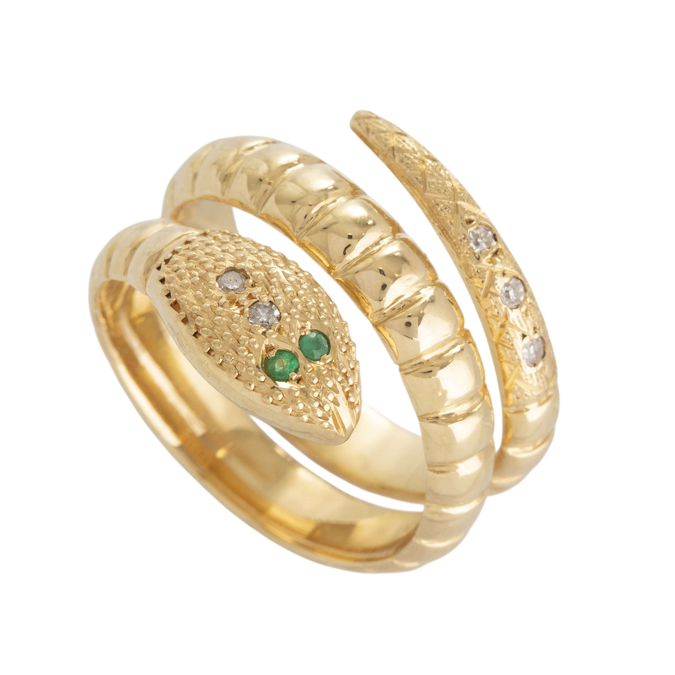 Anel de ouro amarelo com esmeraldas, 0,03ct de brilhantes e 10,7g. Medida 18.