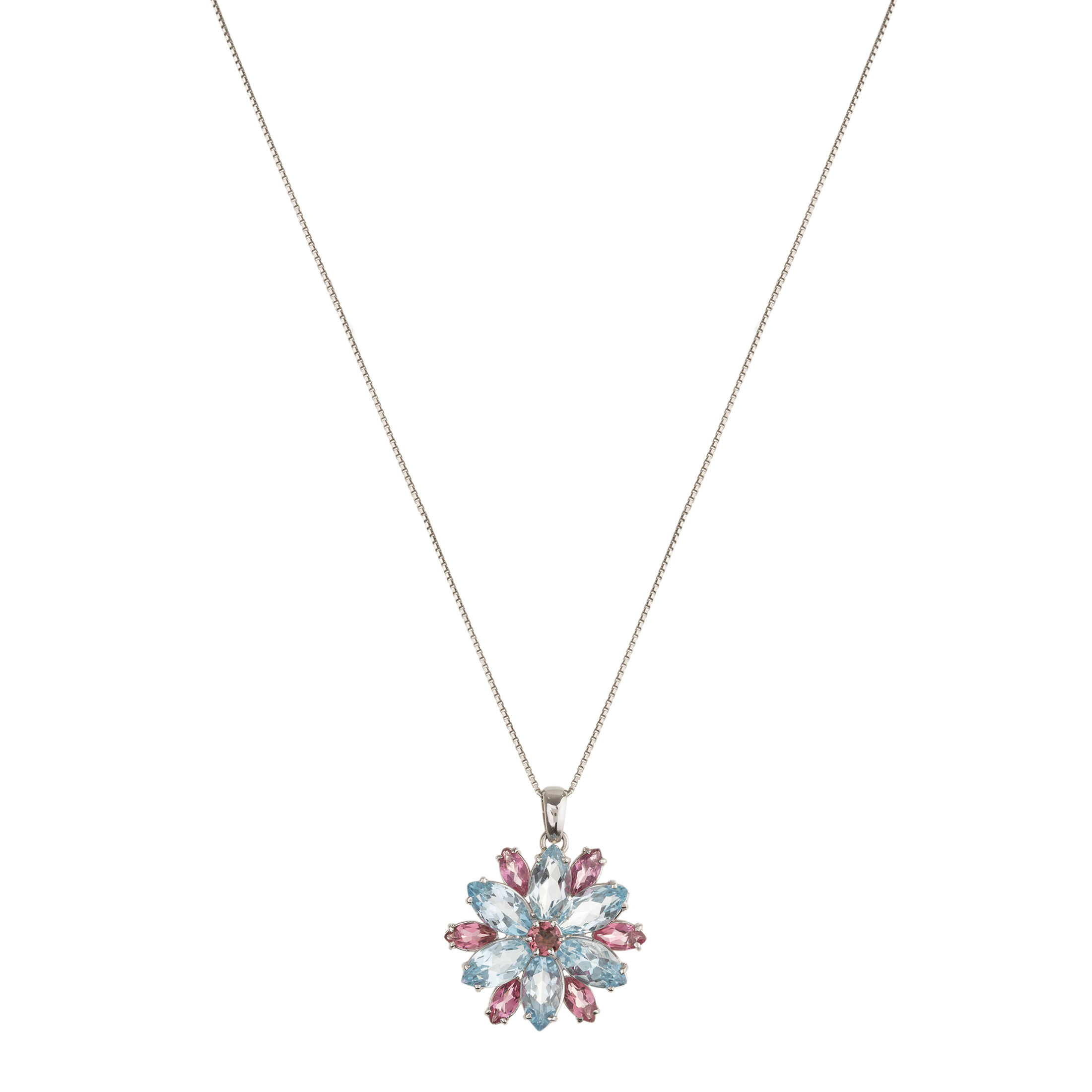 Corrente com pingente de ouro branco, turmalina rosa, topázios e 13,1g. Medidas 3,5cm/50cm.