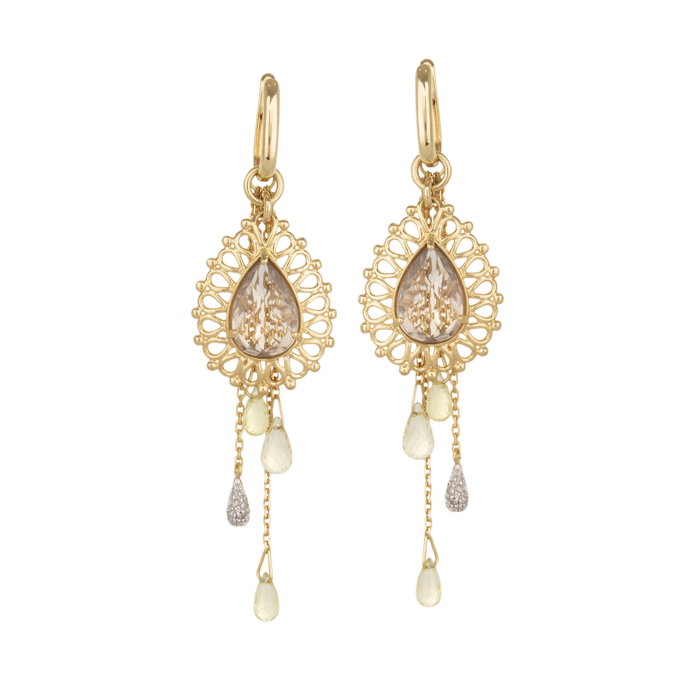 Brinco de ouro amarelo com quartzos, green gold, 0,08ct de brilhantes e 8,9g. Medida 6,1cm.