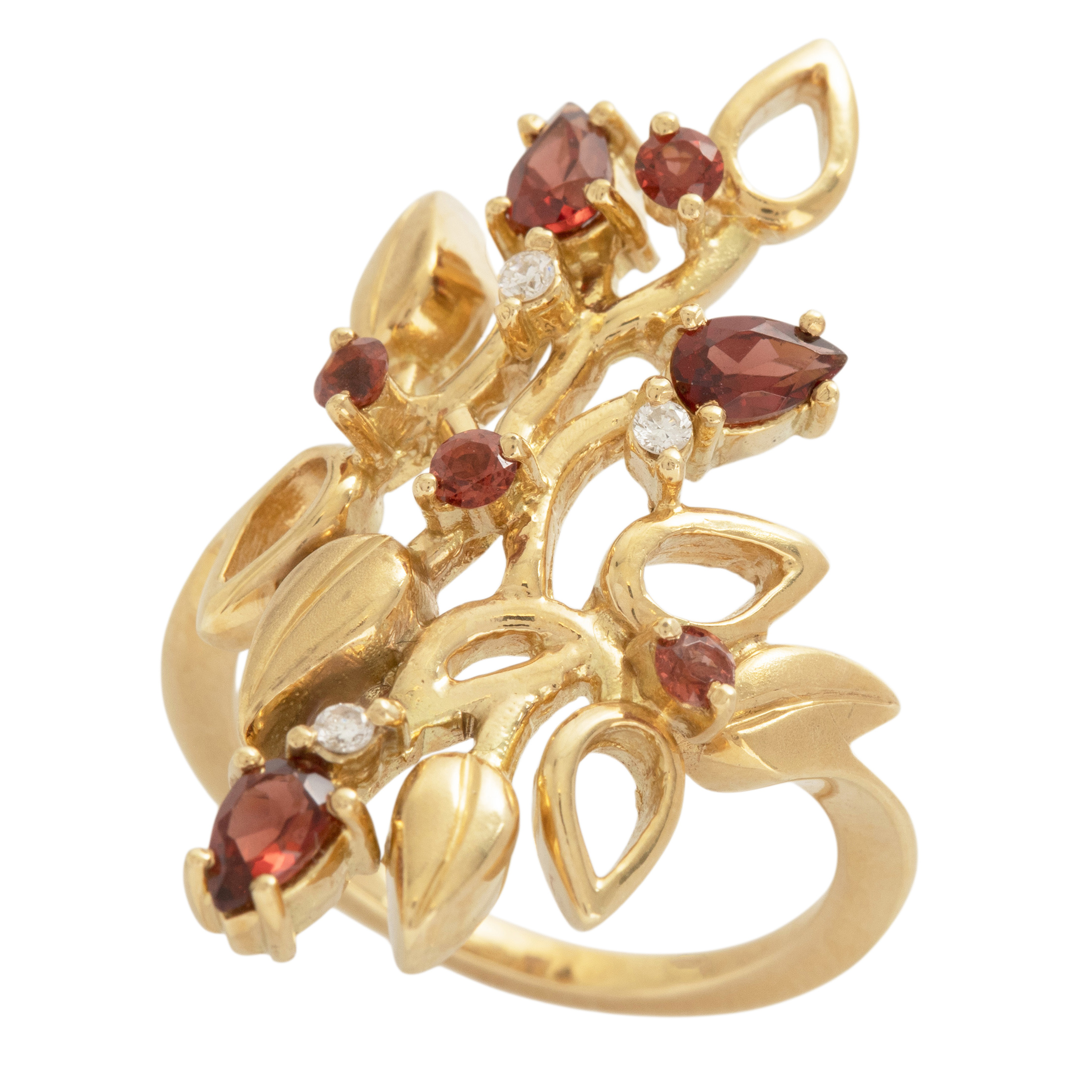 Anel de ouro amarelo com granadas, 0,06ct de brilhantes e 8,4g. Medida 18.