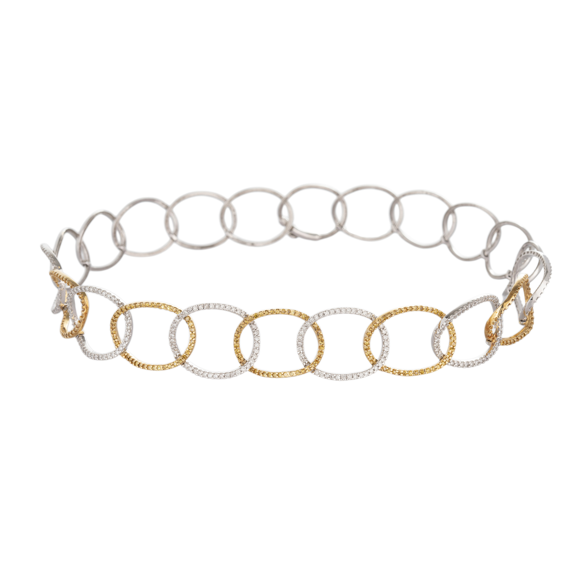 Gargantilha de ouro amarelo e branco com 7,00ct de brilhantes (sendo 3,20ct de brilhantes amarelos tratados) e 51,2g. Medida 43cm.