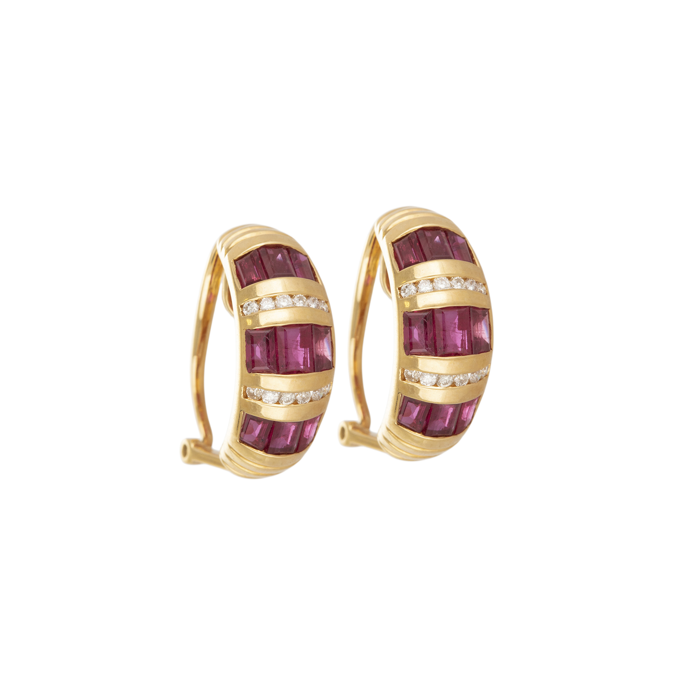 Brinco de ouro amarelo com rubis, 0,20ct de brilhantes e 8,4g. Medida 2cm.
