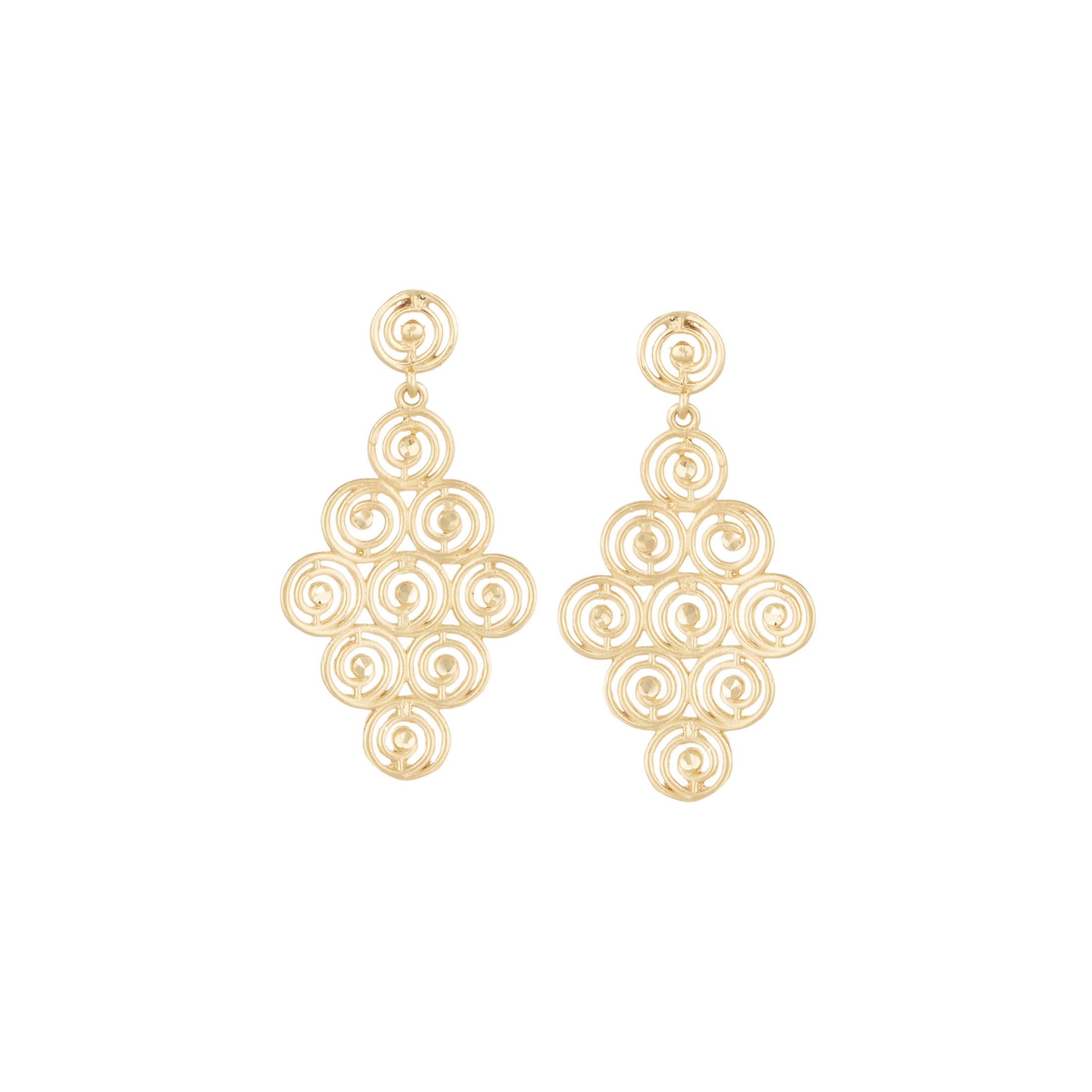Brinco de ouro amarelo corais, 0,13ct de brilhantes e 6,6g. Medida 3,5cm.