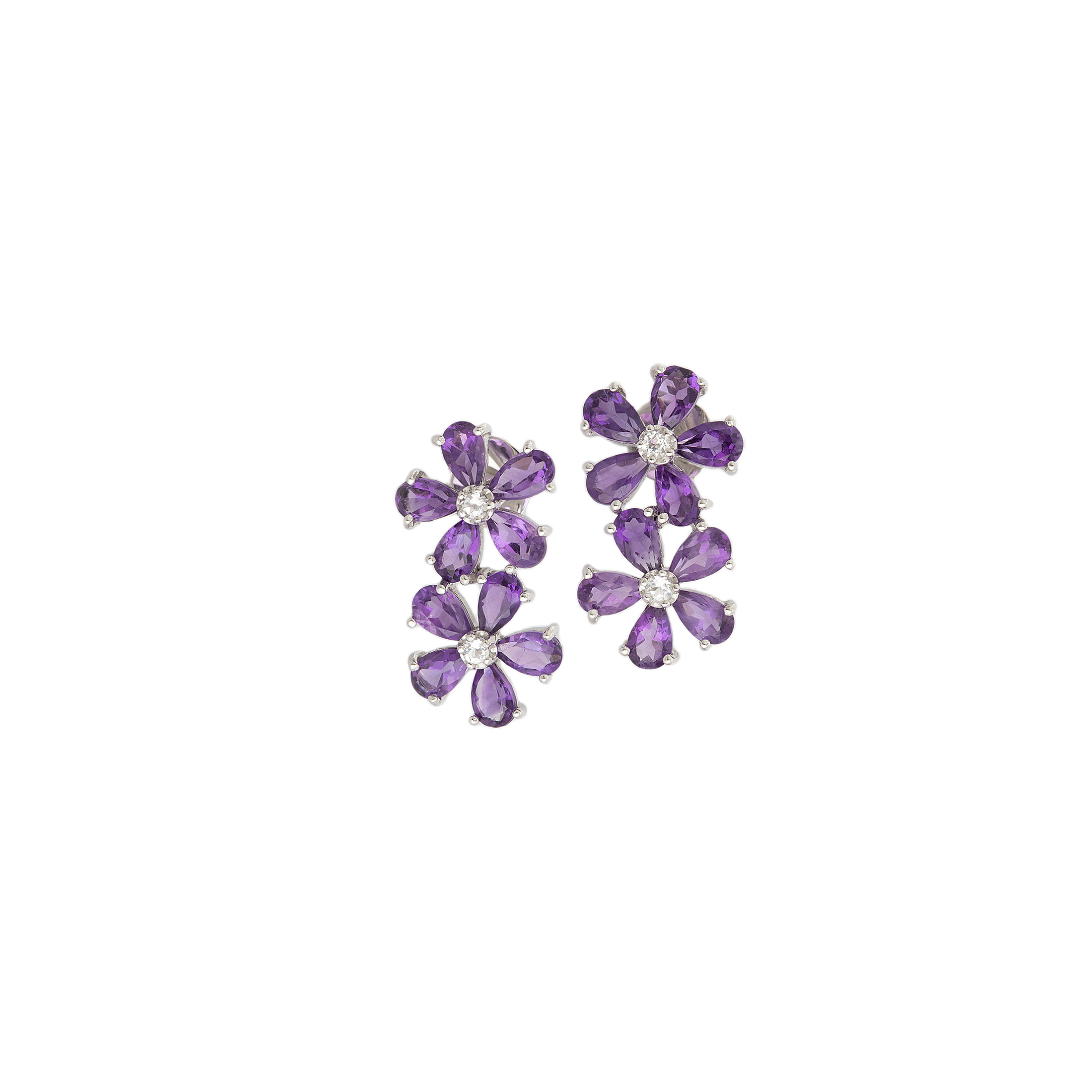 Brinco de ouro branco 14k com ametistas e 0,12ct de brilhantes. Medida 2,1cm.