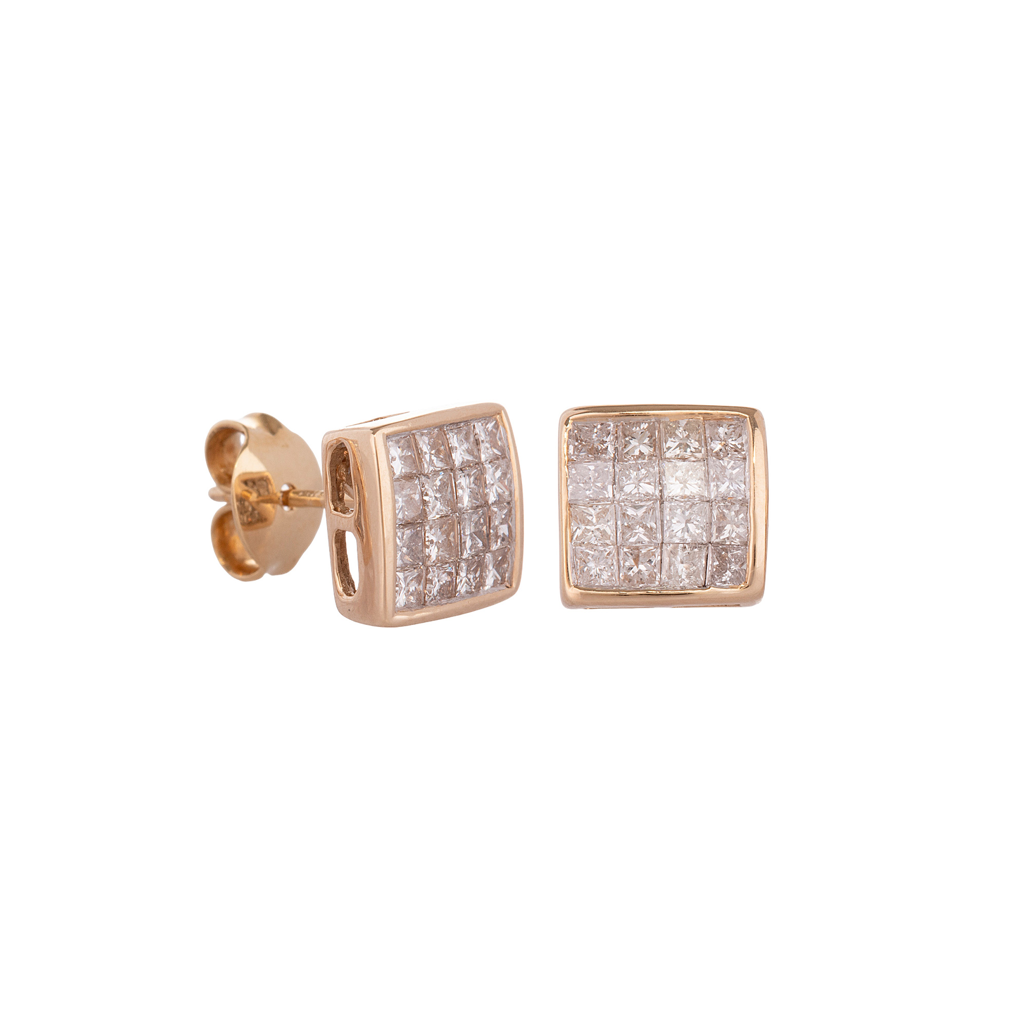 Brinco de ouro amarelo 14k com 1,00ct de diamantes lapidação princess. Medida 0,8cm.