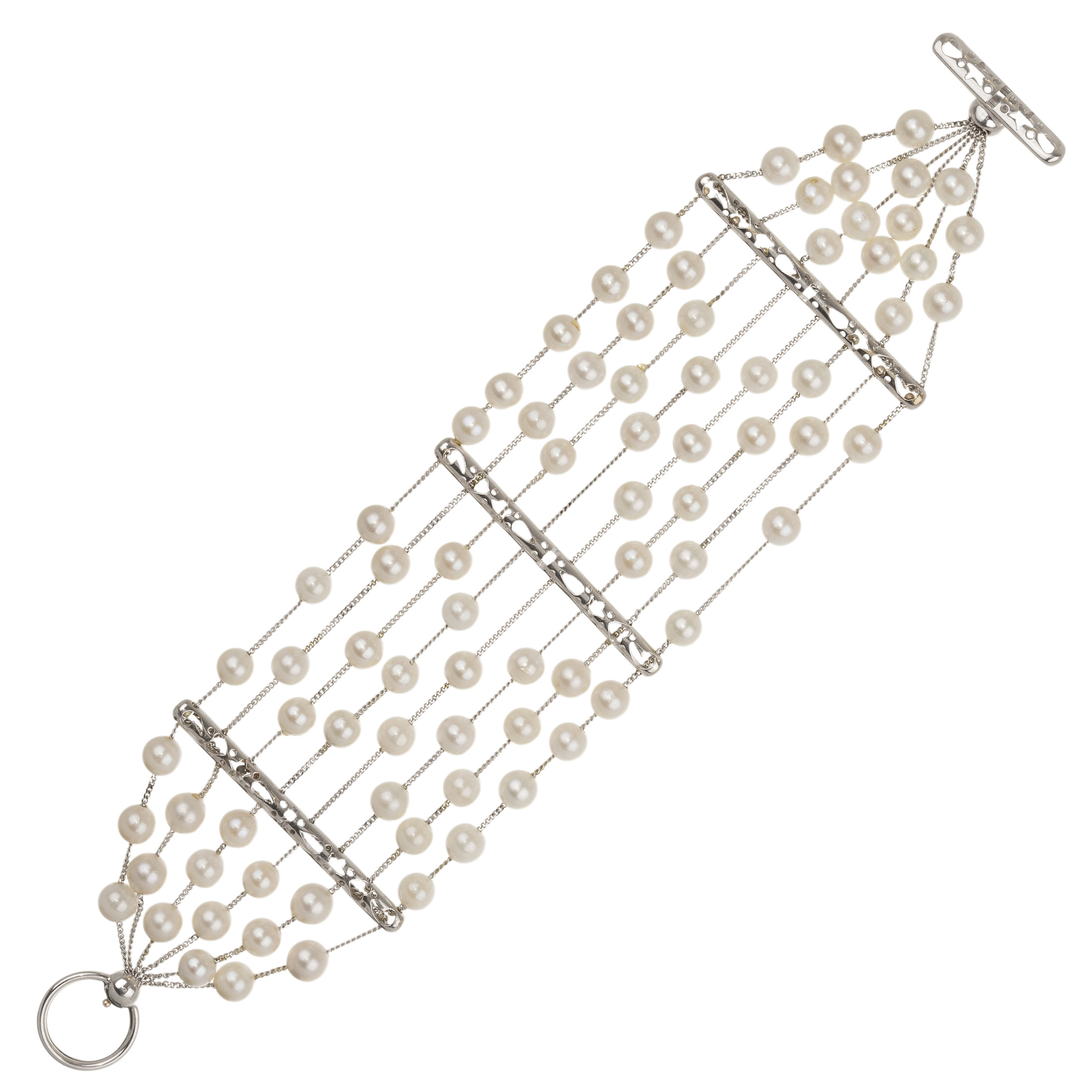 Pulseira de ouro branco com pérolas (6mm) e 37,0g. Medida 19,5cm.