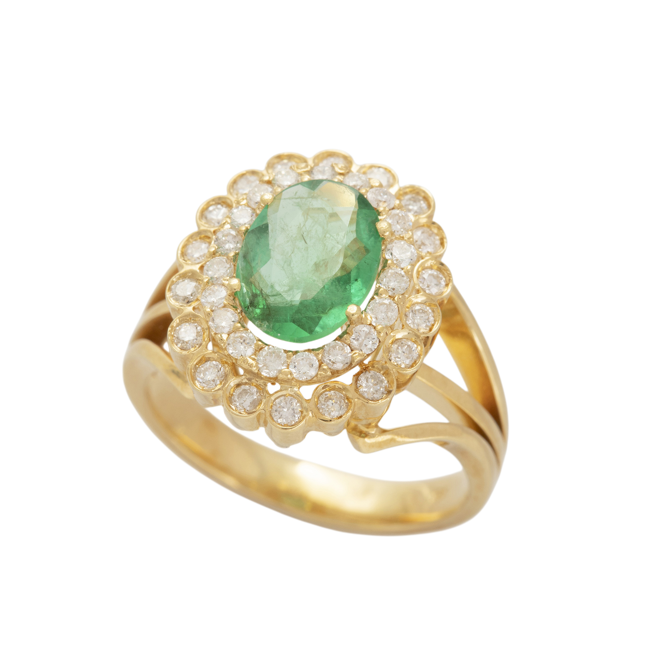 Anel de ouro amarelo com 1,49ct de esmeralda, 0,80ct de brilhantes e 9,1g. Medida 21.