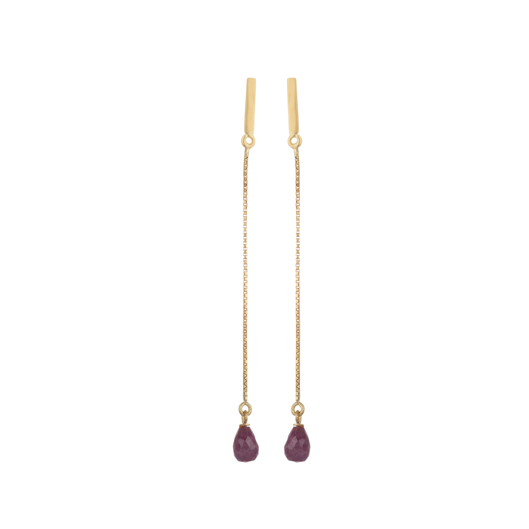 Brinco de ouro amarelo com rubis. Medida 7,5cm.
