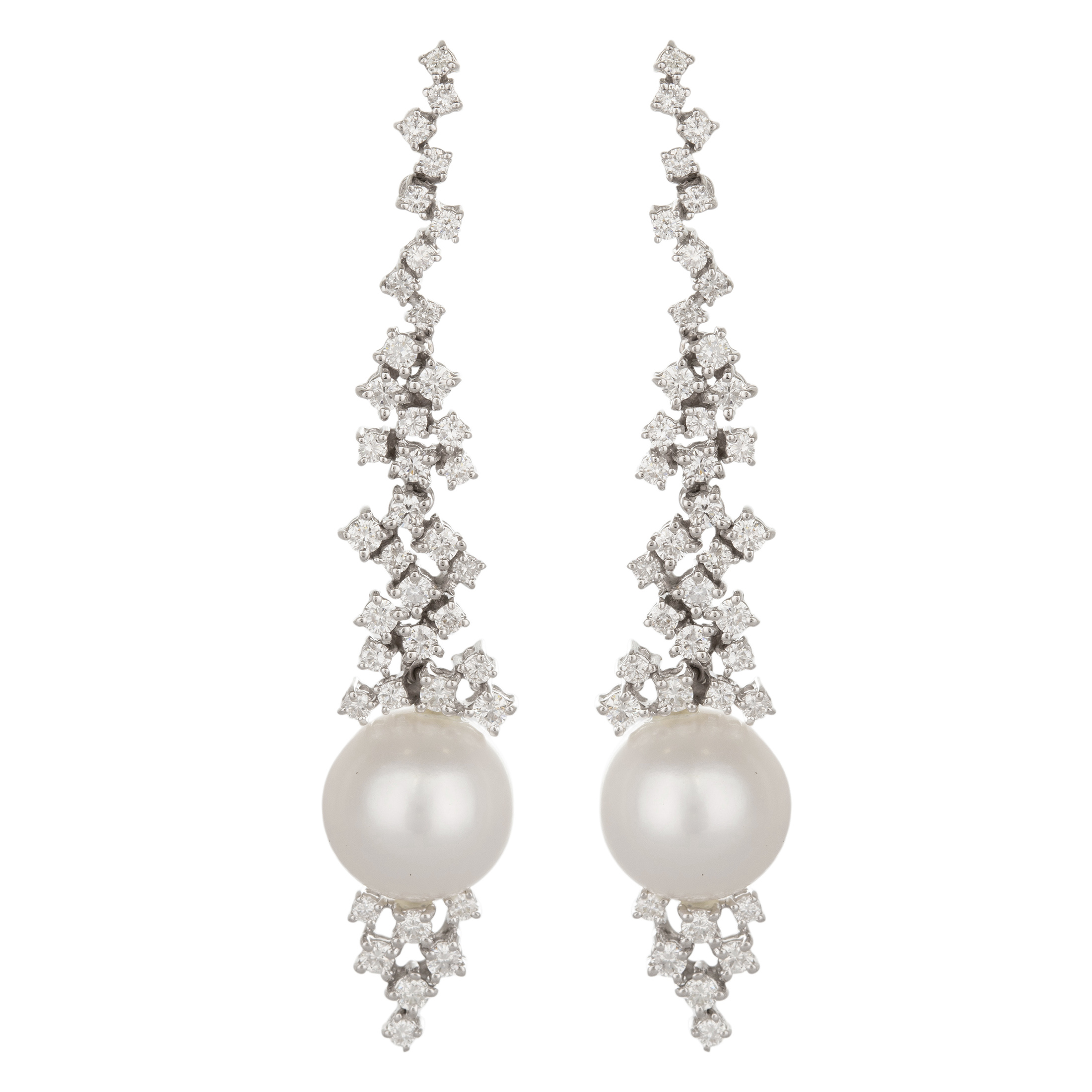 Brinco de ouro branco com pérolas (12mm), 3,20ct de brilhantes H/SI e 16,4g. Medida 6,6cm.