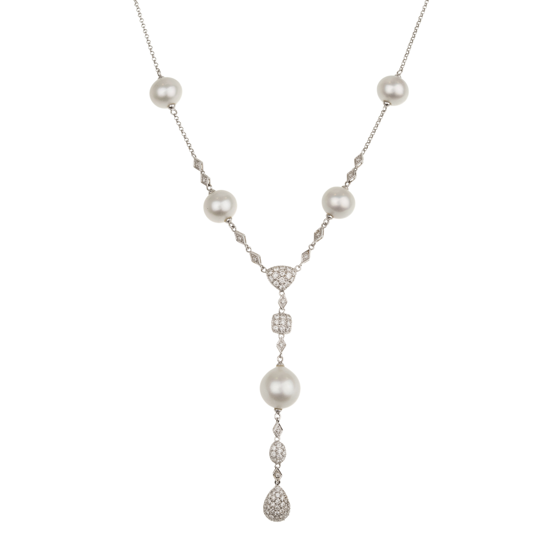 Colar de ouro branco com pérolas (10,5mm a 12,7mm), 2,15ct de brilhantes e 17,8g. Medida 46cm.