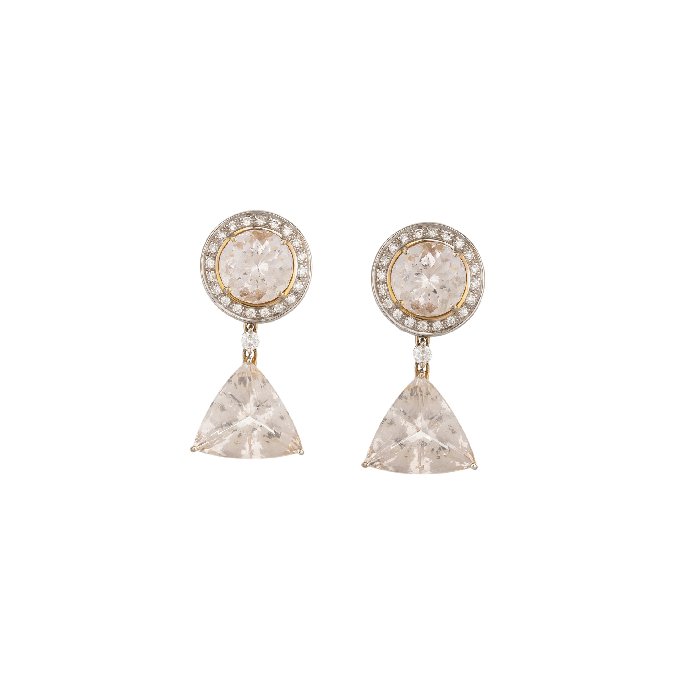 Brinco de ouro amarelo e branco com quartzos rosa, 0,80ct de brilhantes e 12,9g. Medida 3,5cm.