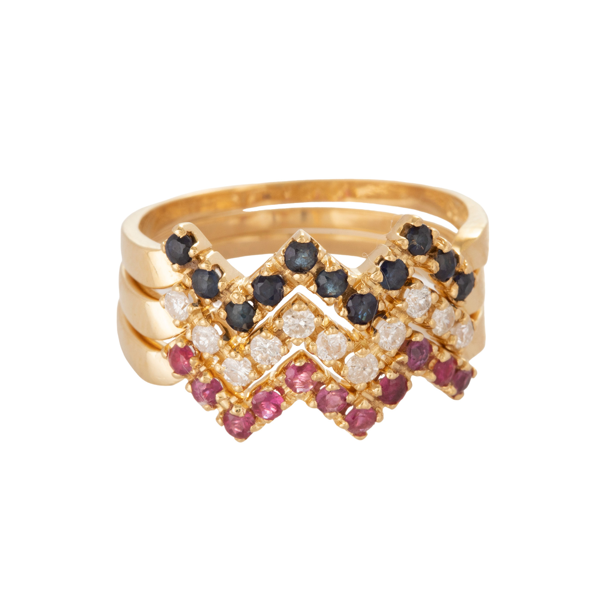 Três anéis de ouro amarelo com rubis, safiras, 0,40ct de brilhantes e 6,0g. Medida 20.