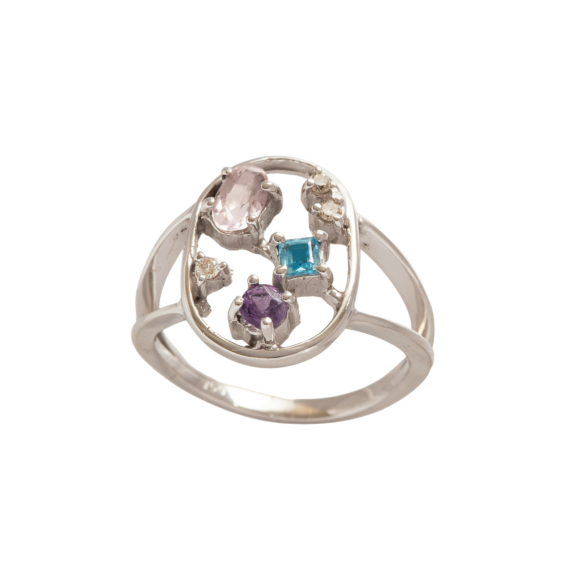 Anel d eouro branco com topázio azul, ametista, quartzo e 0,02ct de brilhantes. Medida 14.